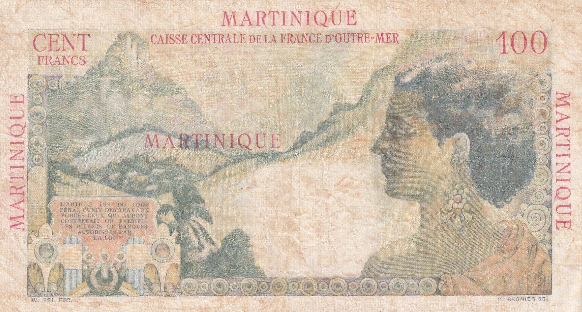 This banknote from Martinique, with a nominal value of 100 francs, was issued in 1946. It belongs to the S.51 series.