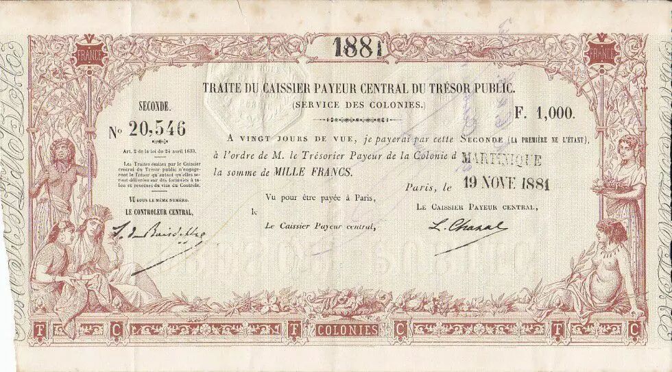 French colonial note - 1881 folds, small tasks in margin. Scarce note of Kolsky s collectionIssuing date : 1881-11-19