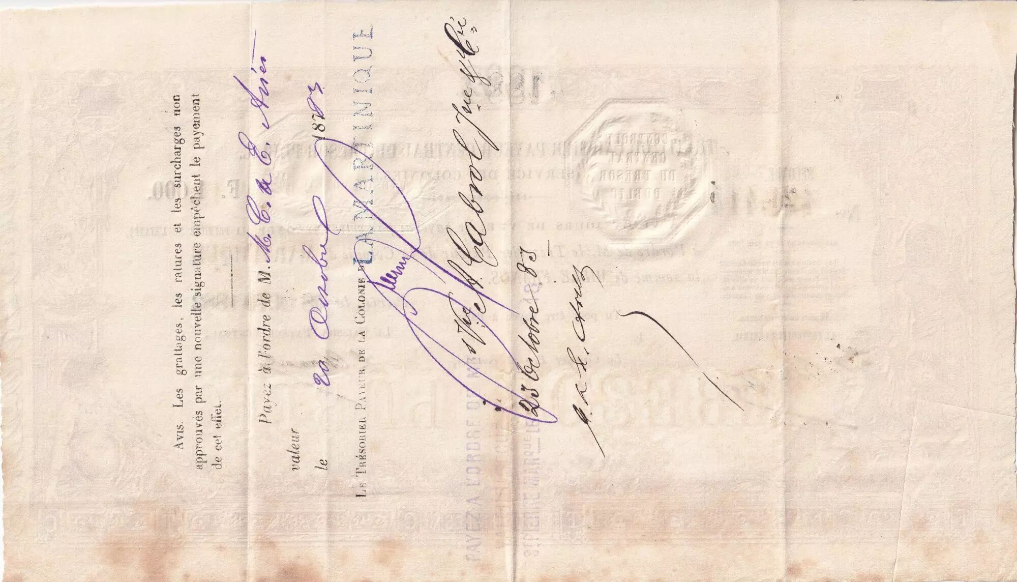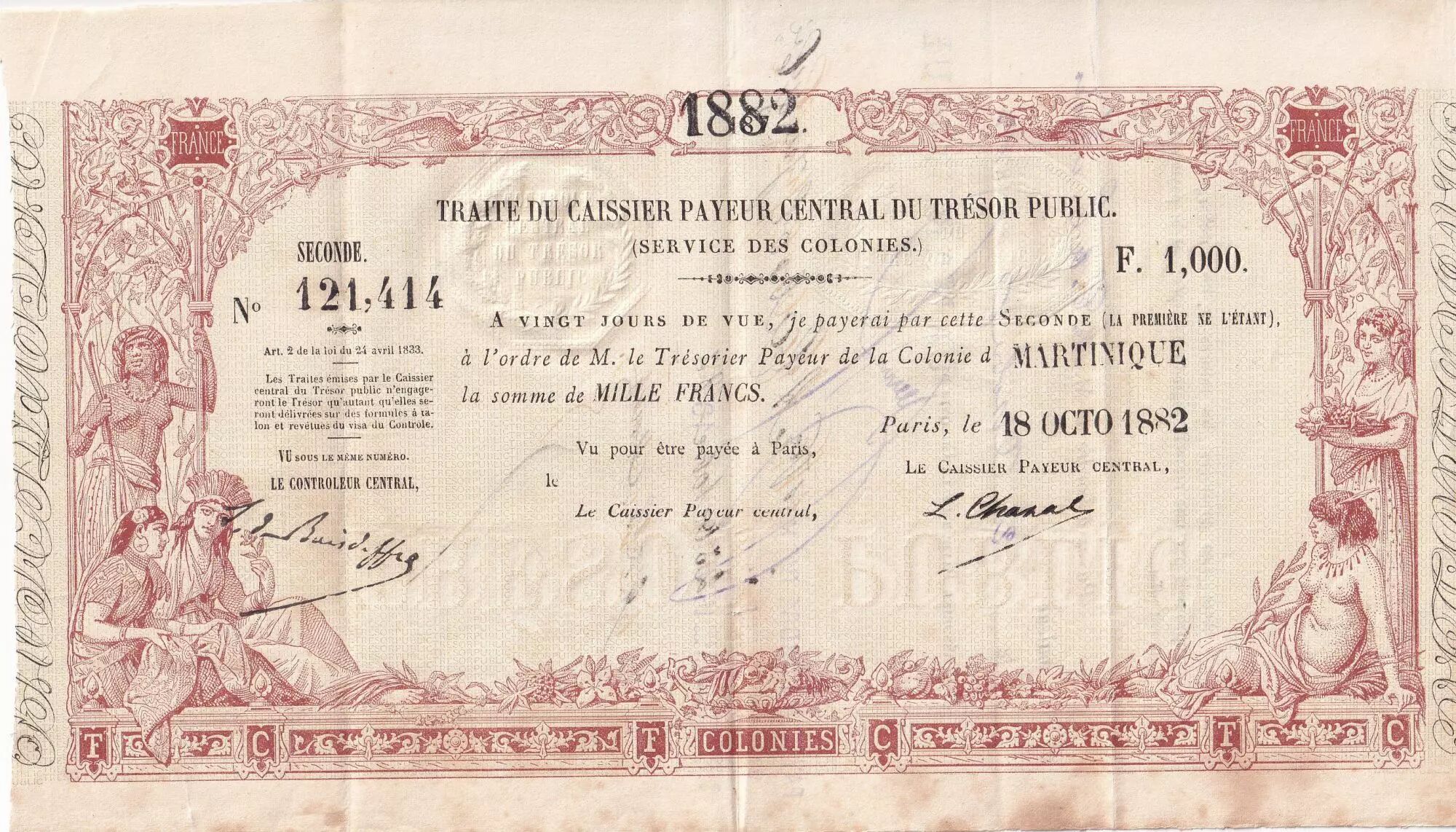 Banknote Martinique 1000 Francs - French colonial note - Sign. Chazal - 18-10-1882 - Kol.N°45
