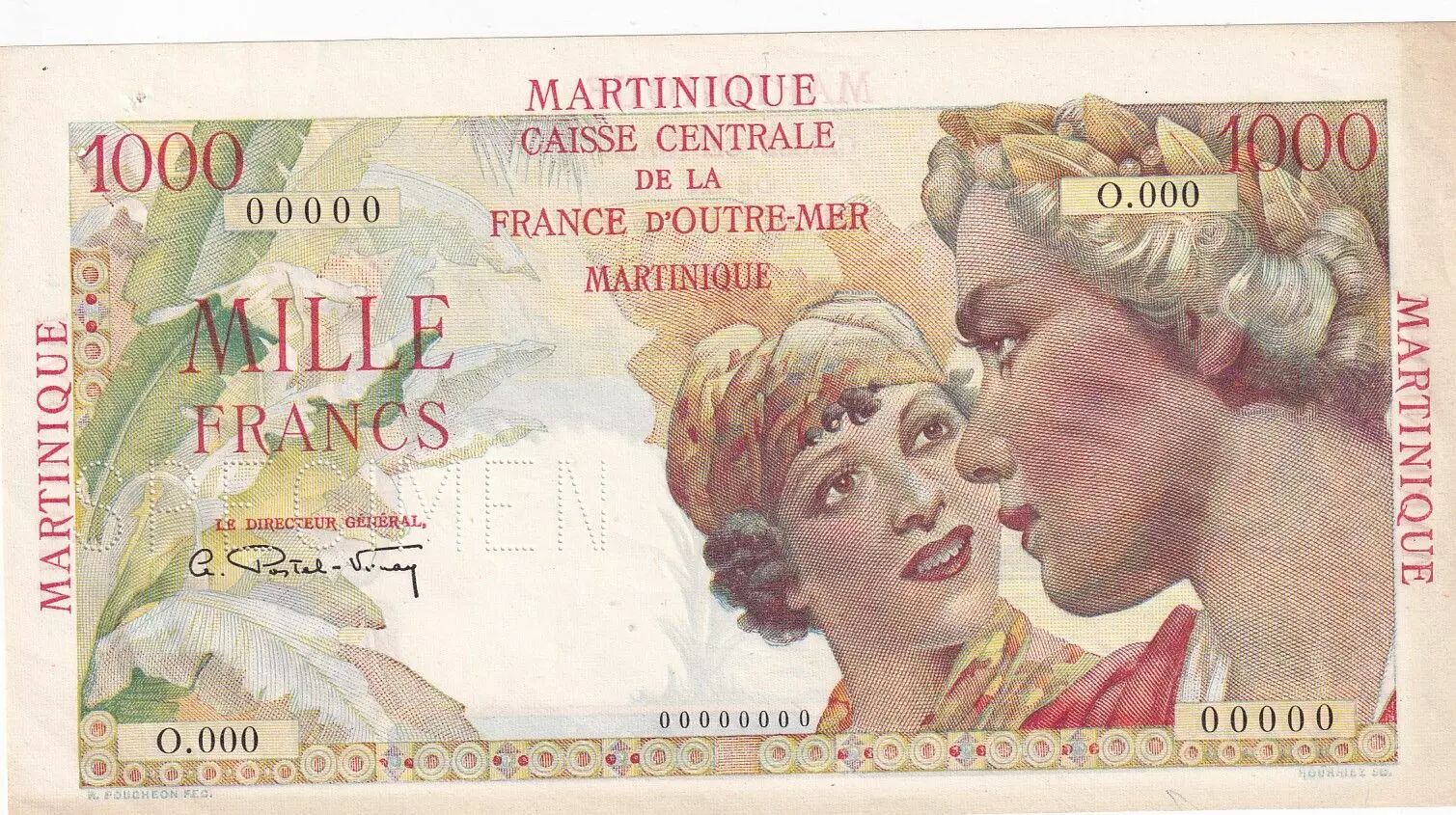 Ce billet de 1000 francs, émis en 1946, est un spécimen de la Martinique sous l'Union française. Il s'agit d'une surimpression du billet P#26 de l'Afrique équatoriale française, modifié pour être utilisé en Martinique.