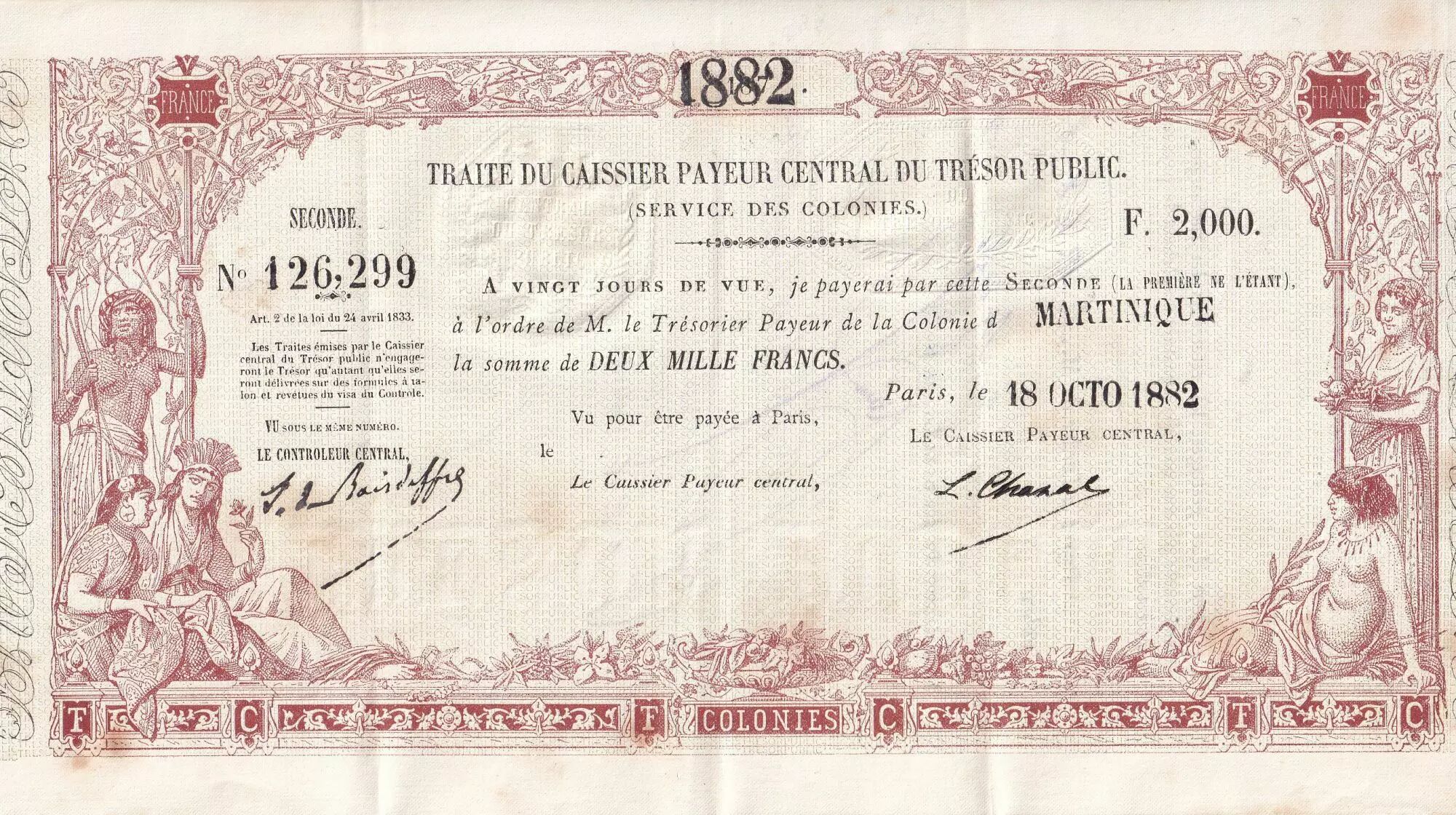 Banknote Martinique 2000 Francs - French colonial note - Sign. Chazal - 18-10-1882 - Kol.N°47var