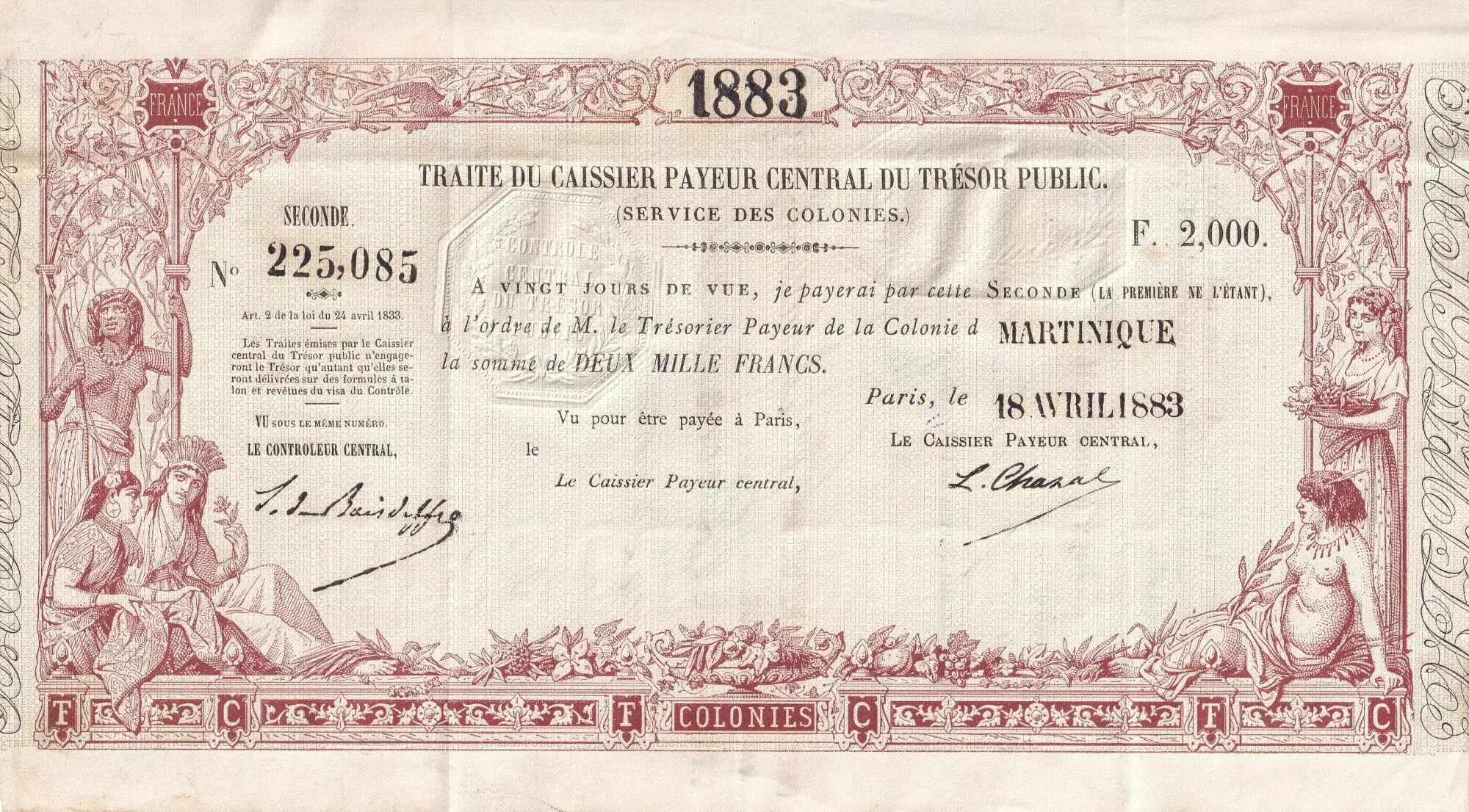 Billet Martinique 2000 Francs - Traite du Trésor Public - Sign. Chazal - 18-04-1883 - Kol.N°47