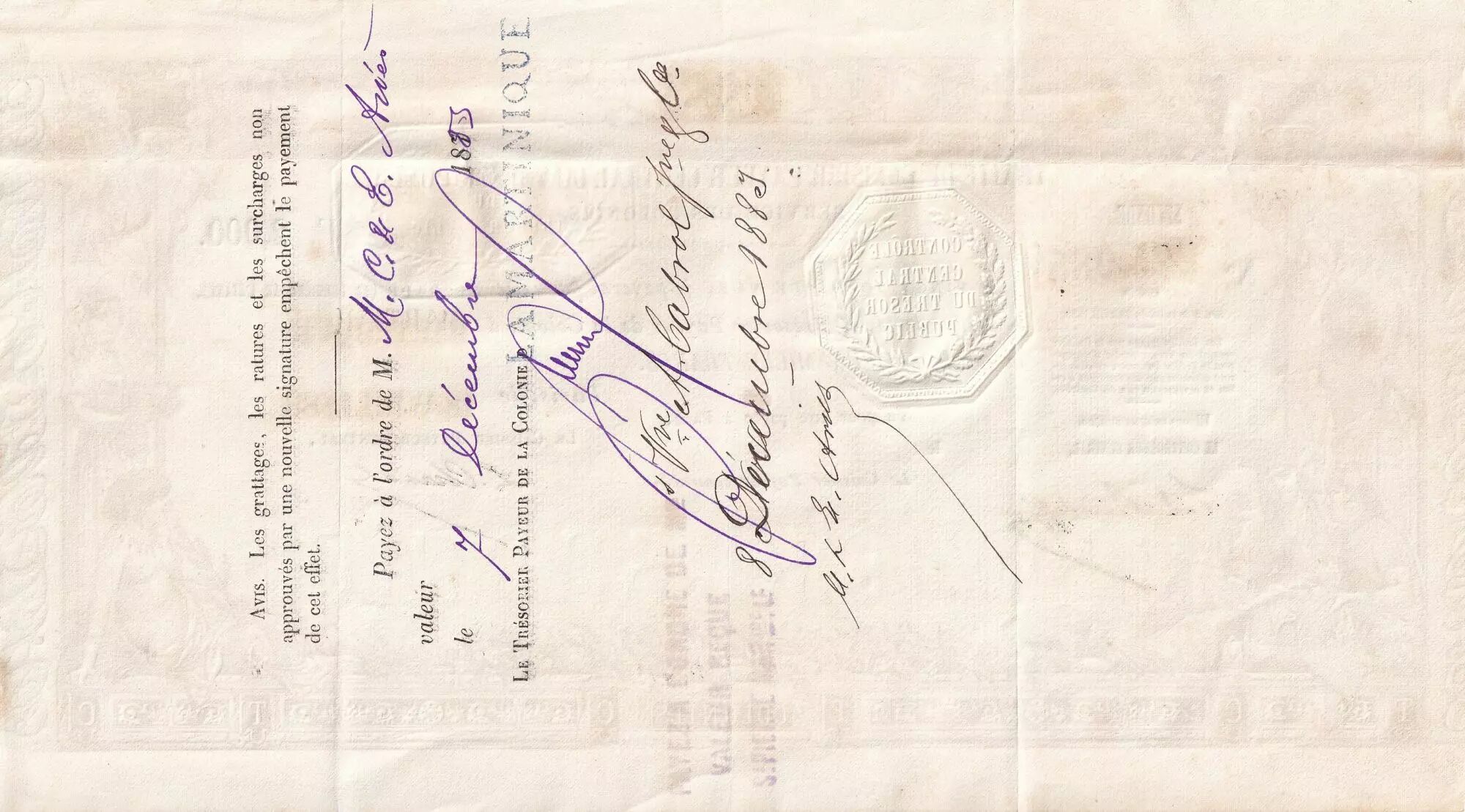 Accueil > Billets du Monde > Billets d'Amérique > Martinique > Martinique 2000 Francs - Traite du Trésor Public - Sign. Chazal - 18-04-1883 - Kol.N°47