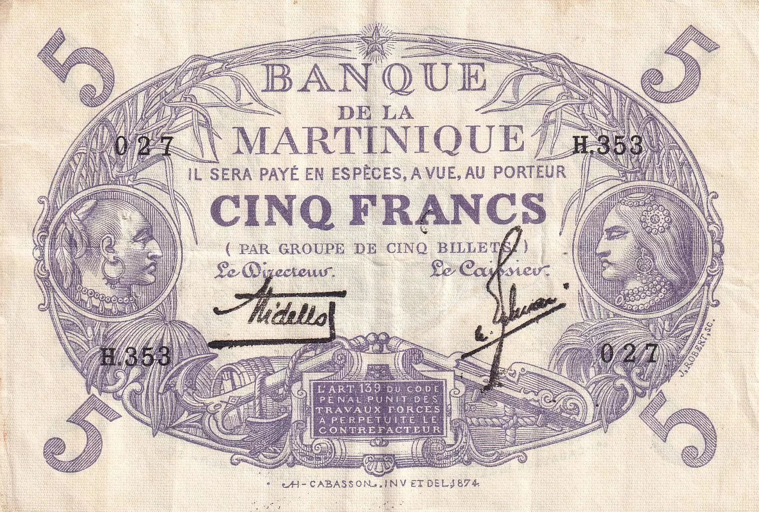 Accueil > Archivage > Martinique 5 Francs Cabasson, Violet - 1901 (1934) Série H.353 - TTB - P.6