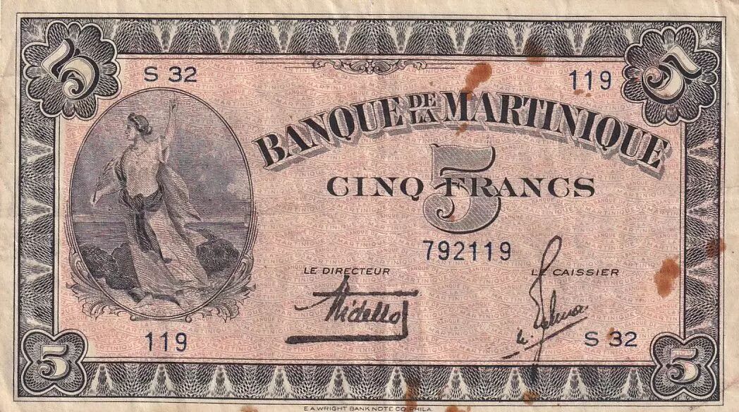Au recto, le billet arbore une impression en noir sur un fond rouge mat. Un élément central de cette face est la figure féminine allégorique positionnée à gauche. Les inscriptions en latin mentionnent "BANQUE DE LA MARTINIQUE" ainsi que la valeur nominale "CINQ FRANCS". On y trouve également la mention de l'imprimeur, "E. A WRIGHT BANK NOTE CO., PHILA."
