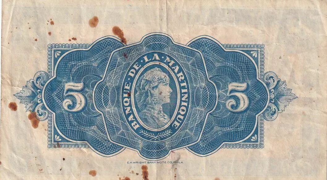 The reverse of the banknote is printed in blue. The main motif is a portrait of a woman located in the center. The inscriptions, also in Latin, repeat the nominal value "5" twice, as well as the name of the issuing institution "BANQUE DE LA MARTINIQUE". The printer, "E. A WRIGHT BANK NOTE CO., PHILA.", is mentioned again.