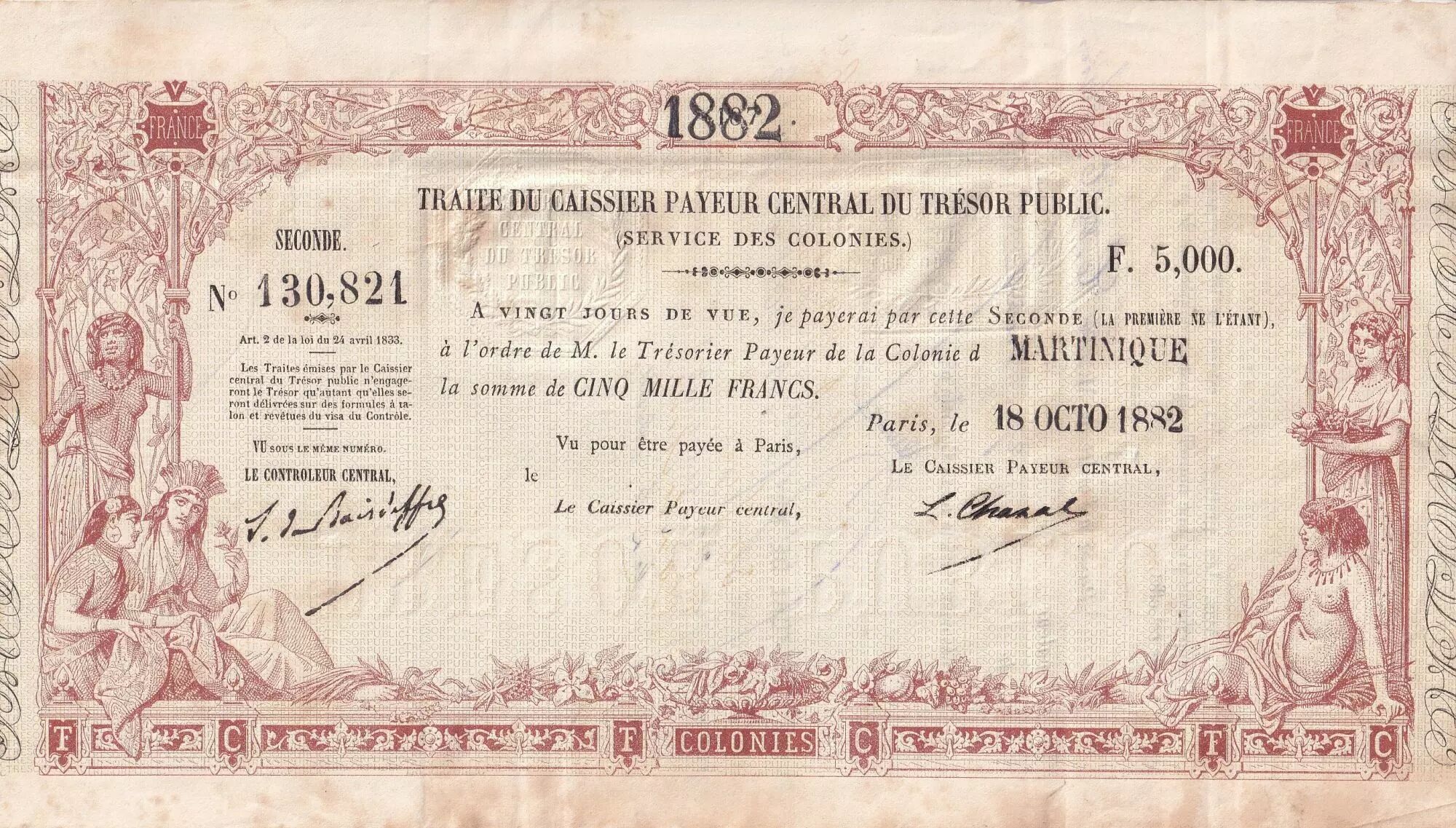 Banknote Martinique 5000 Francs - French colonial note - Sign. Chazal - 18-10-1882 - Kol.N°46