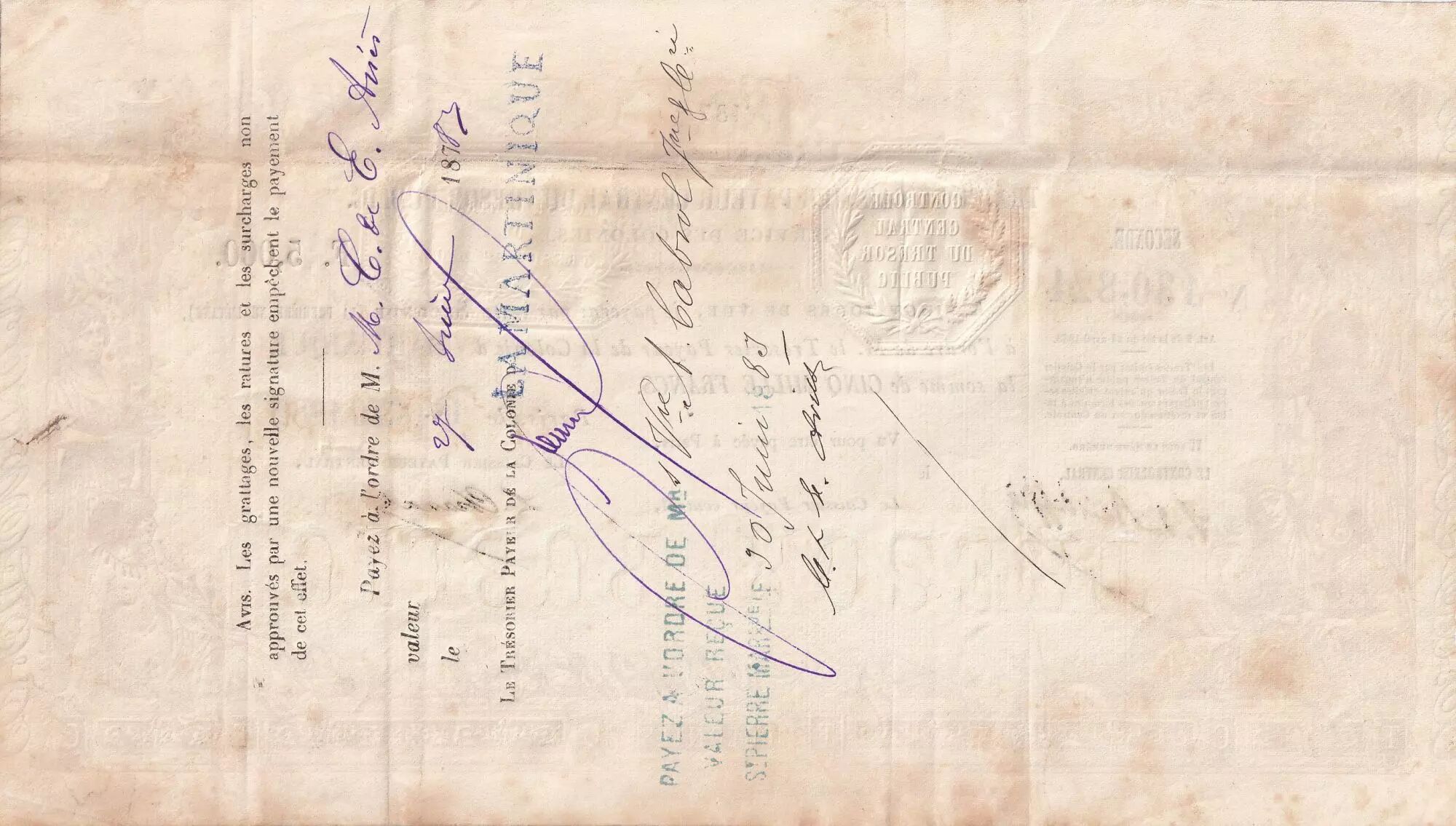 Home > World Banknotes > American Banknotes > Martinique > Martinique 5000 Francs - French colonial note - Sign. Chazal - 18-10-1882 - Kol.N°46