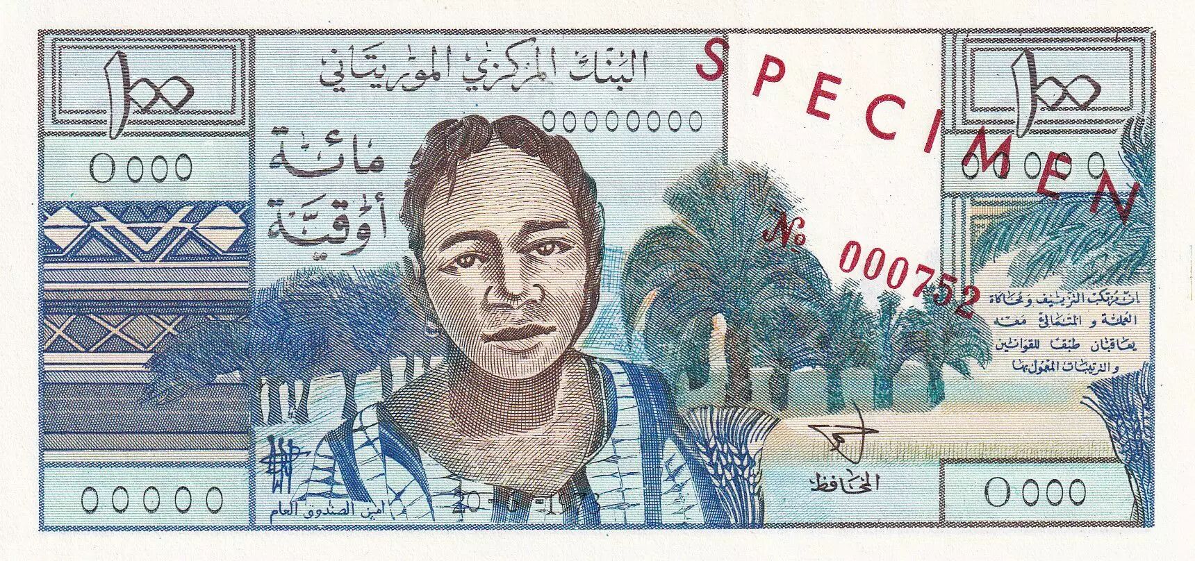 Banknote Mauritania 100 Ouguiya - Woman, palms trees - Fishermens - Specimen - ND (1973) - P.1s