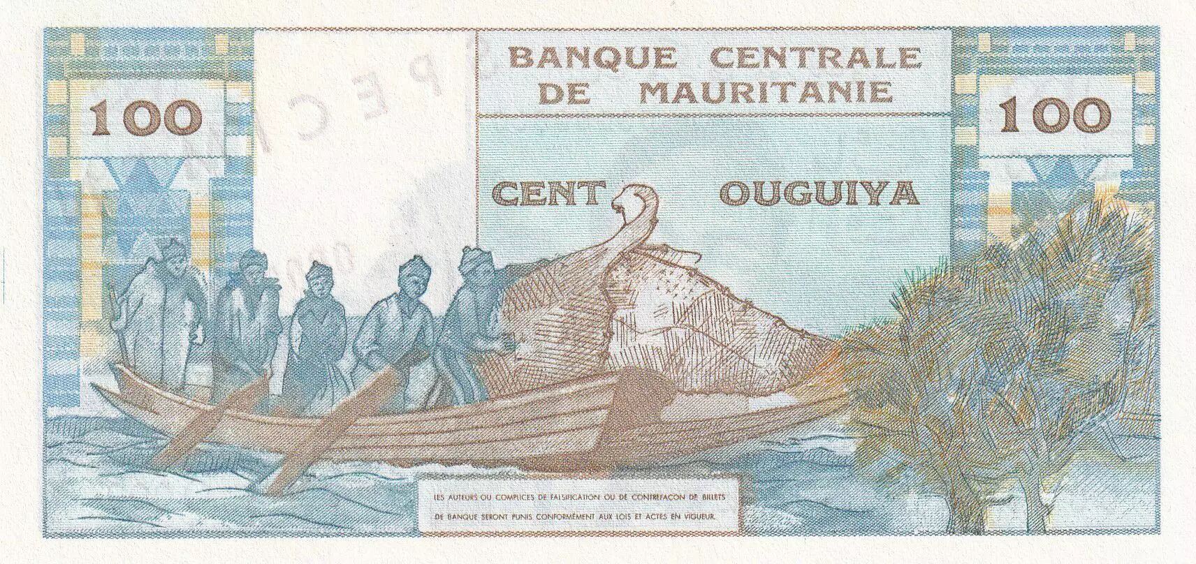Billet Mauritanie 100 Ouguiya - Femme, palmiers - Pêcheurs - Specimen - ND (1973) - P.1s