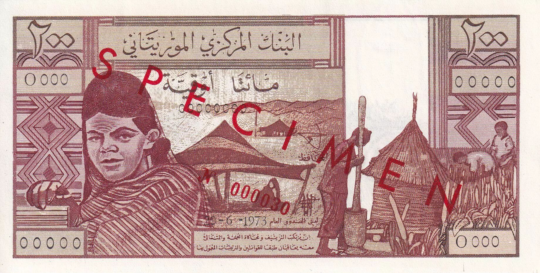 Accueil > Archivage > Mauritanie 200 Ouguiya - Jeune fille, scène de village - Spécimen - ND (1973) - P.2s