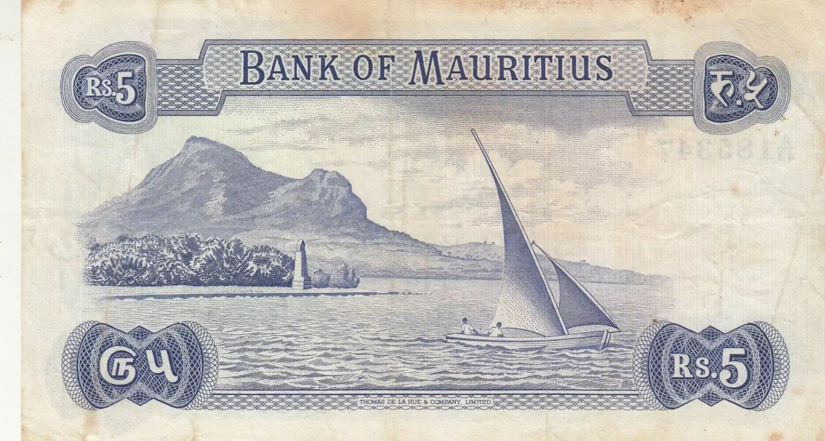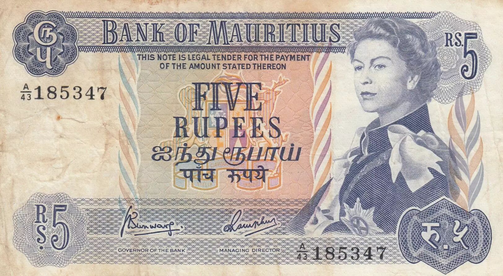 The 5 Mauritian Rupee note, issued in 1967 (series A.43), measures 140 × 78 mm and features a classic style with pastel tones. The obverse features a portrait of Queen Elizabeth II, a symbol of the colonial era, accompanied by the inscriptions "Bank of Mauritius" and "This note is legal tender for the payment of the amount stated thereon ? Five Rupees," confirming its legal value.