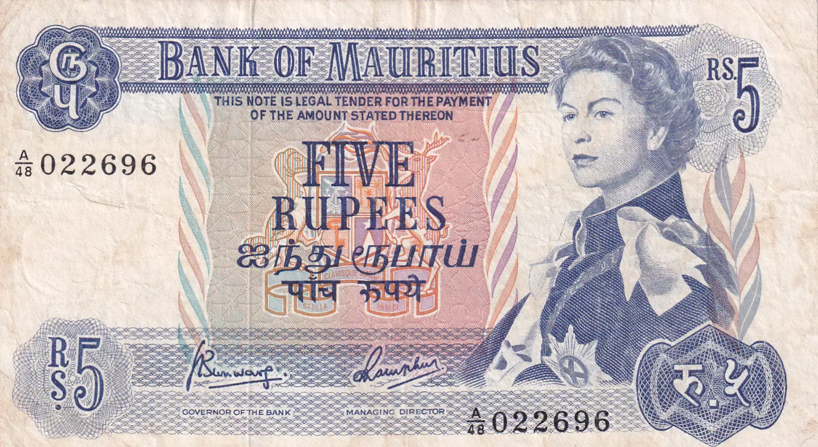 Home > > Mauritius 5 Rupees Elizabeth II - Serial A.48 - VF - P.30c