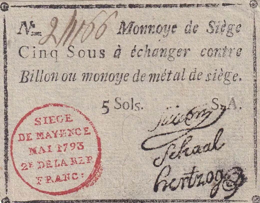 Billet Mayence 5 Sols Noir - Tampon rouge - Mai 1793 - Série A