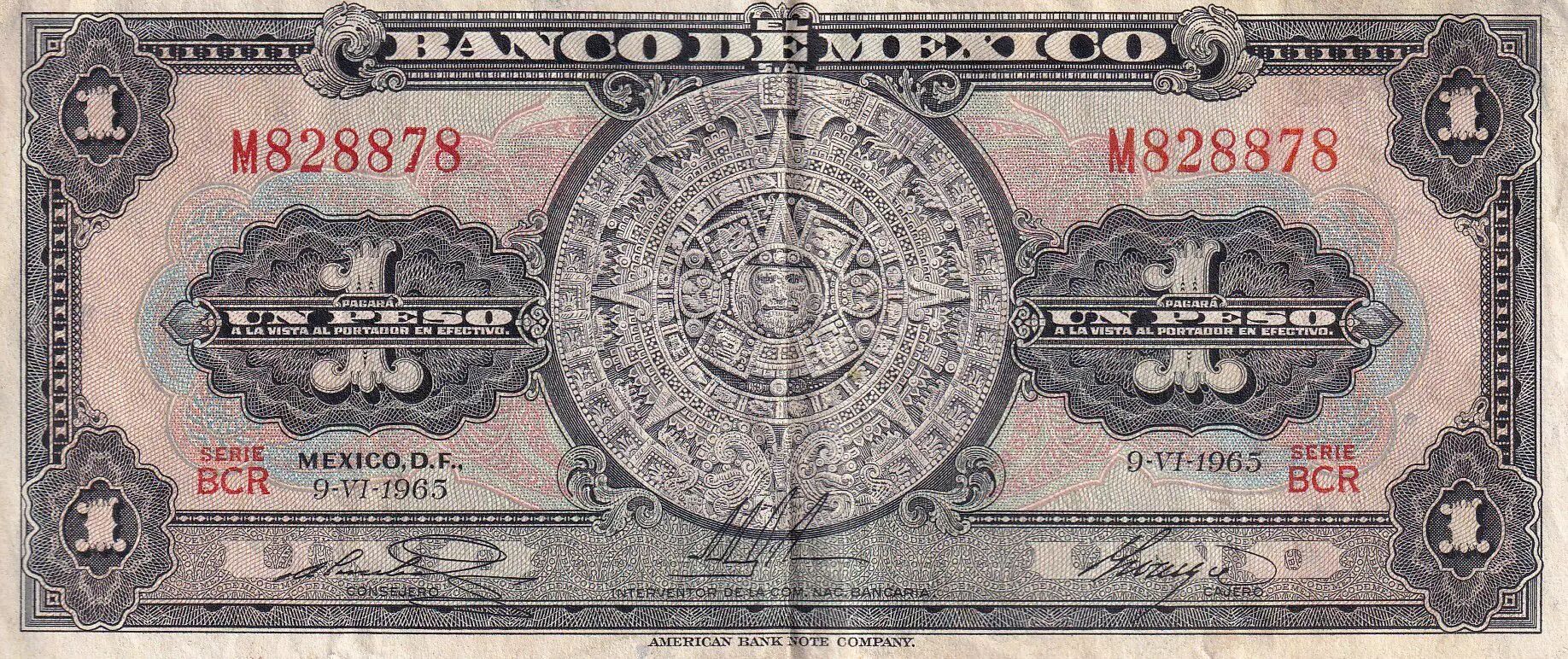 Home > > Mexico 1 Peso - Aztec calendar - Monument - 1965 - Serial BCR - P.59i
