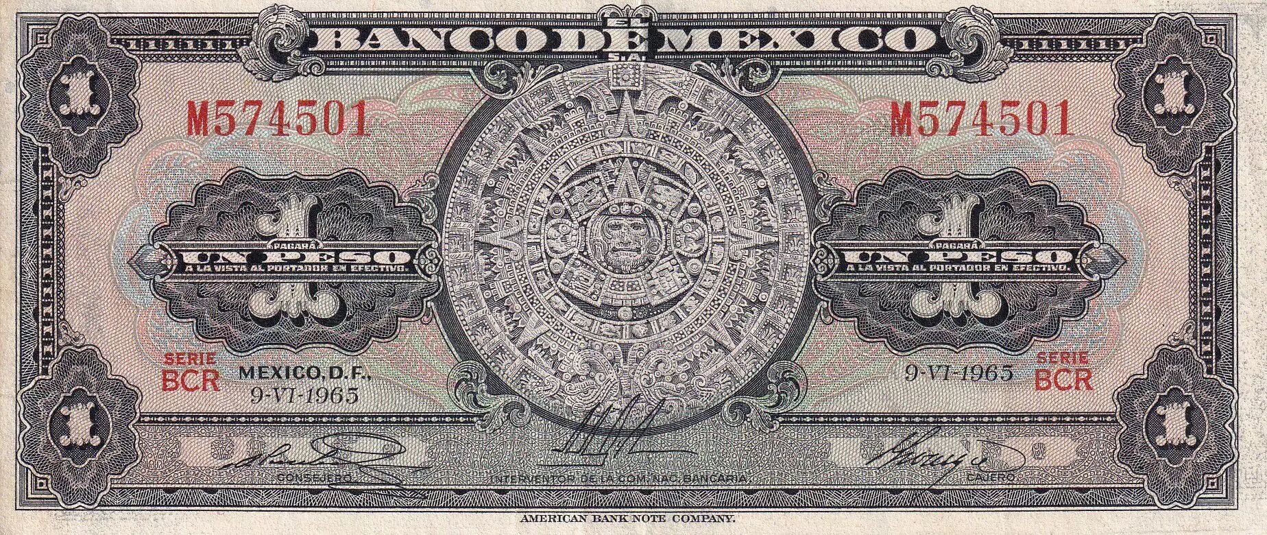 Home > > Mexico 1 Peso - Aztec calendar - Monument - 1965 - Serial BCR - P.59i