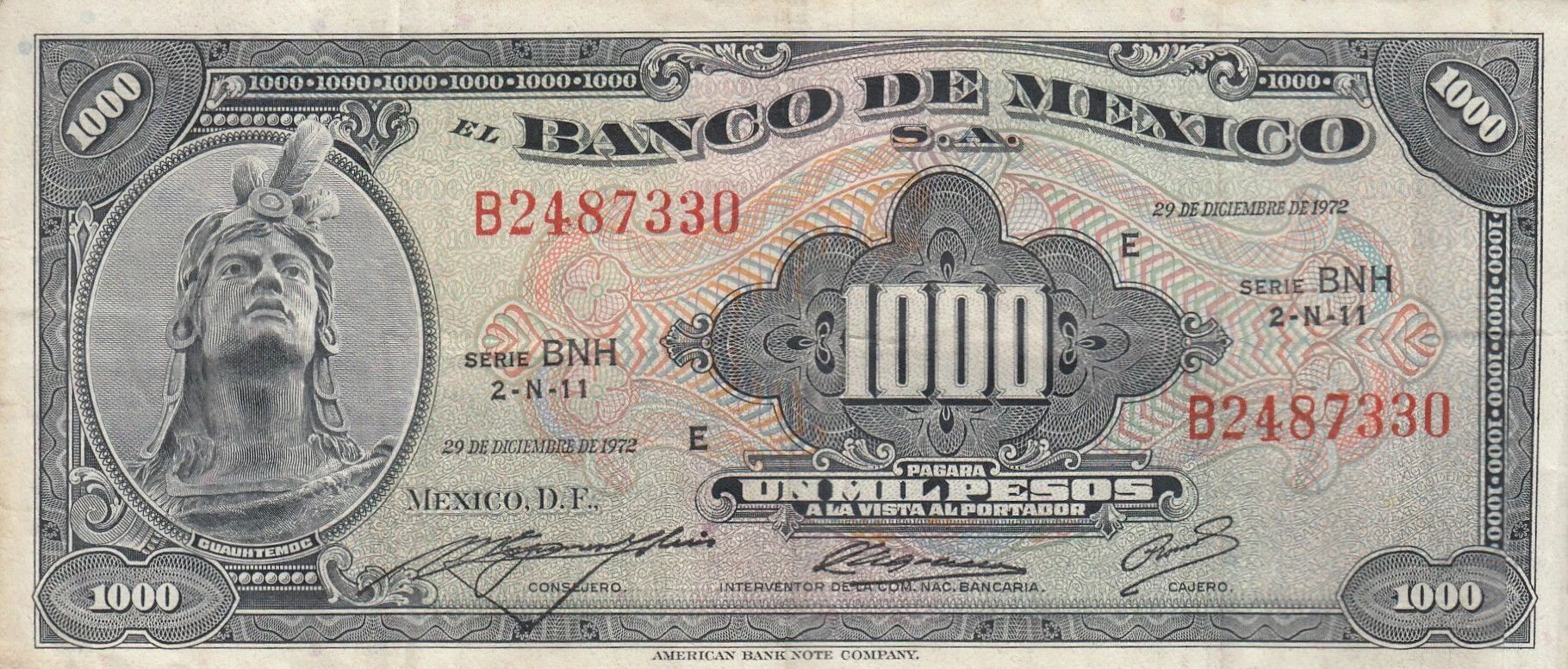The 1000 Mexican pesos banknote, issued in 1972, is a specimen from the BNH series. It measures 155 millimeters in length and 67 millimeters in width.