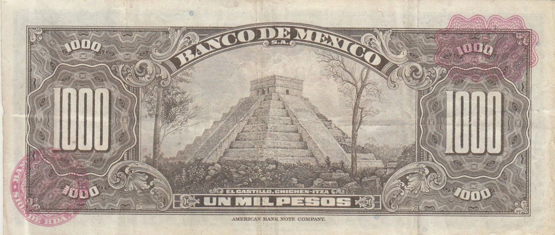 On the back, the banknote features a representation of the Pyramid of Kukulcán, located at the archaeological site of Chichén Itzá. This Mayan monument, known for its particular architecture and astronomical alignment, symbolizes the rich pre-Columbian heritage of Mexico. The pyramid is reproduced with attention to architectural details, allowing one to appreciate the complexity of its structure. The face value is mentioned again, as well as decorative elements that complete the overall aesthetics of the banknote.
