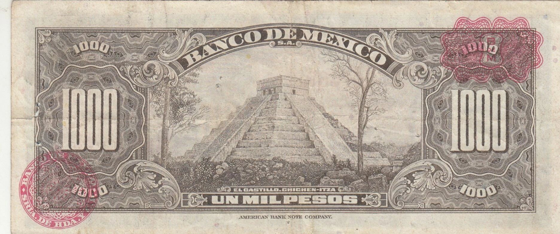 On the back, the banknote features a representation of the Pyramid of Kukulcán, located on the archaeological site of Chichen Itza. This Mayan monument, renowned for its particular architecture and astronomical alignment, symbolizes Mexico's rich pre-Columbian heritage. The pyramid is reproduced with attention to architectural details, allowing one to appreciate the complexity of its structure. The face value is mentioned again, as well as decorative elements that complete the overall aesthetic of the banknote.