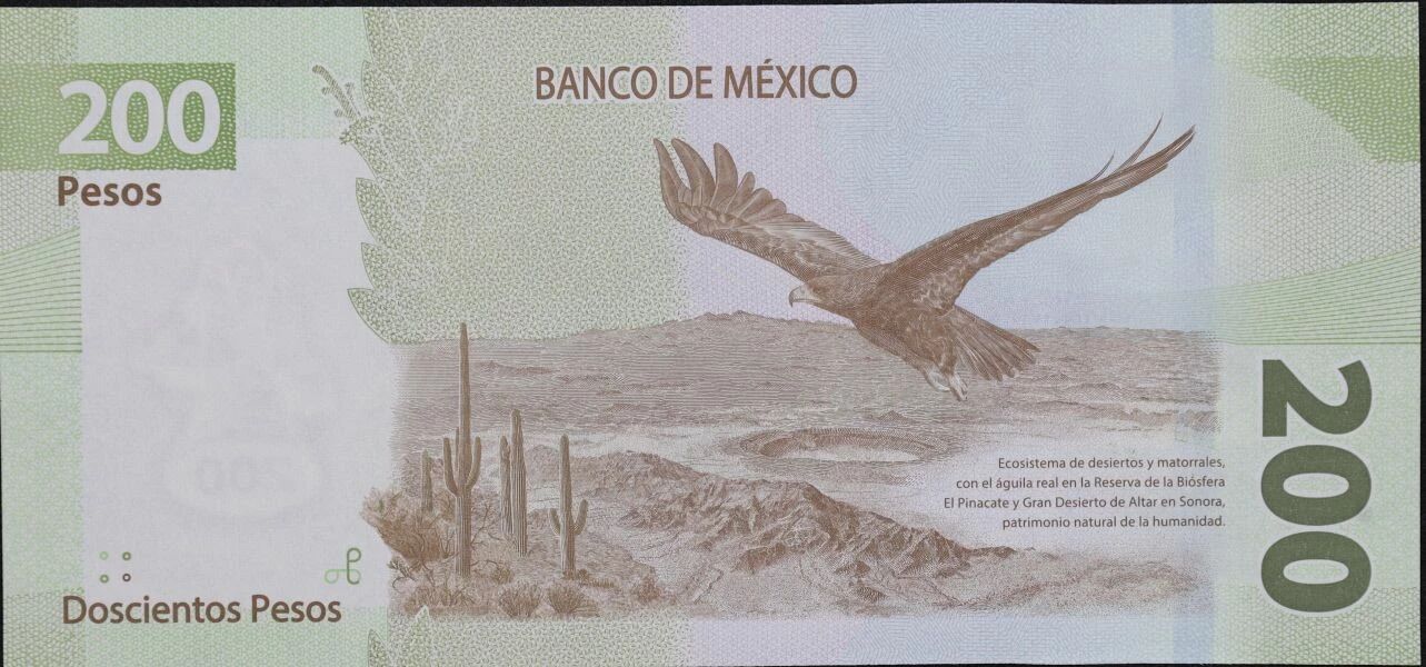 The face value of the banknote is 200 pesos. The Mexican peso is the official monetary unit of Mexico. Mexican peso banknotes are used for everyday financial transactions in the country.