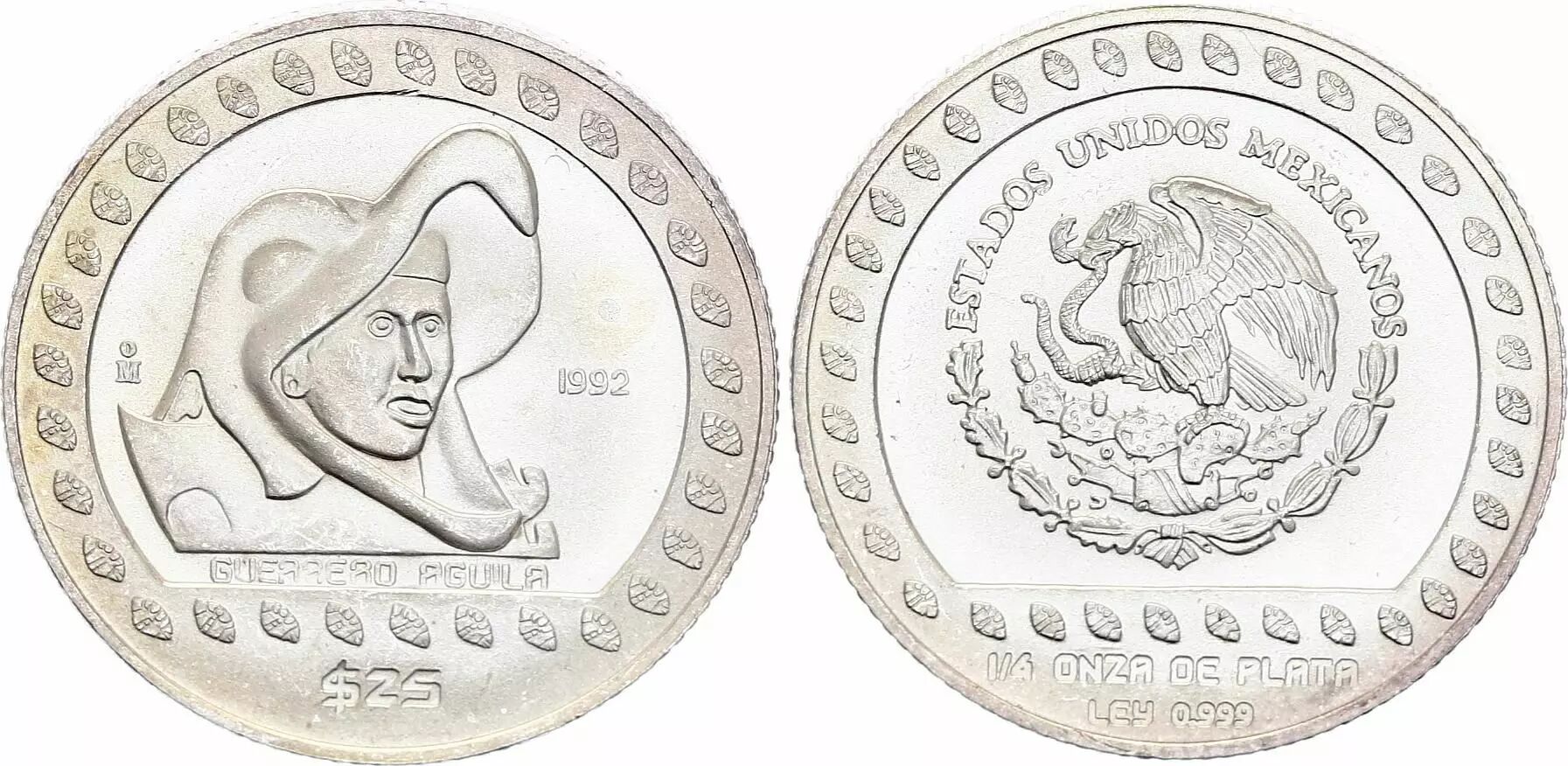 Coin Mexico 25 Pesos Guerrero Aguiula - 1/4 OZ de Plata - Silver 1992