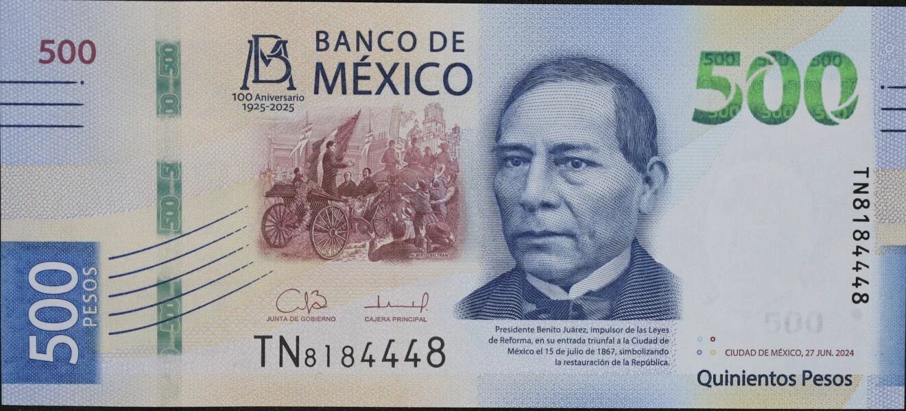 This commemorative banknote, with a face value of 500 pesos, was issued by Mexico in 2025. It celebrates the 100th anniversary of the Bank of Mexico. The banknote is made of polymer, a durable material often used for modern banknotes.