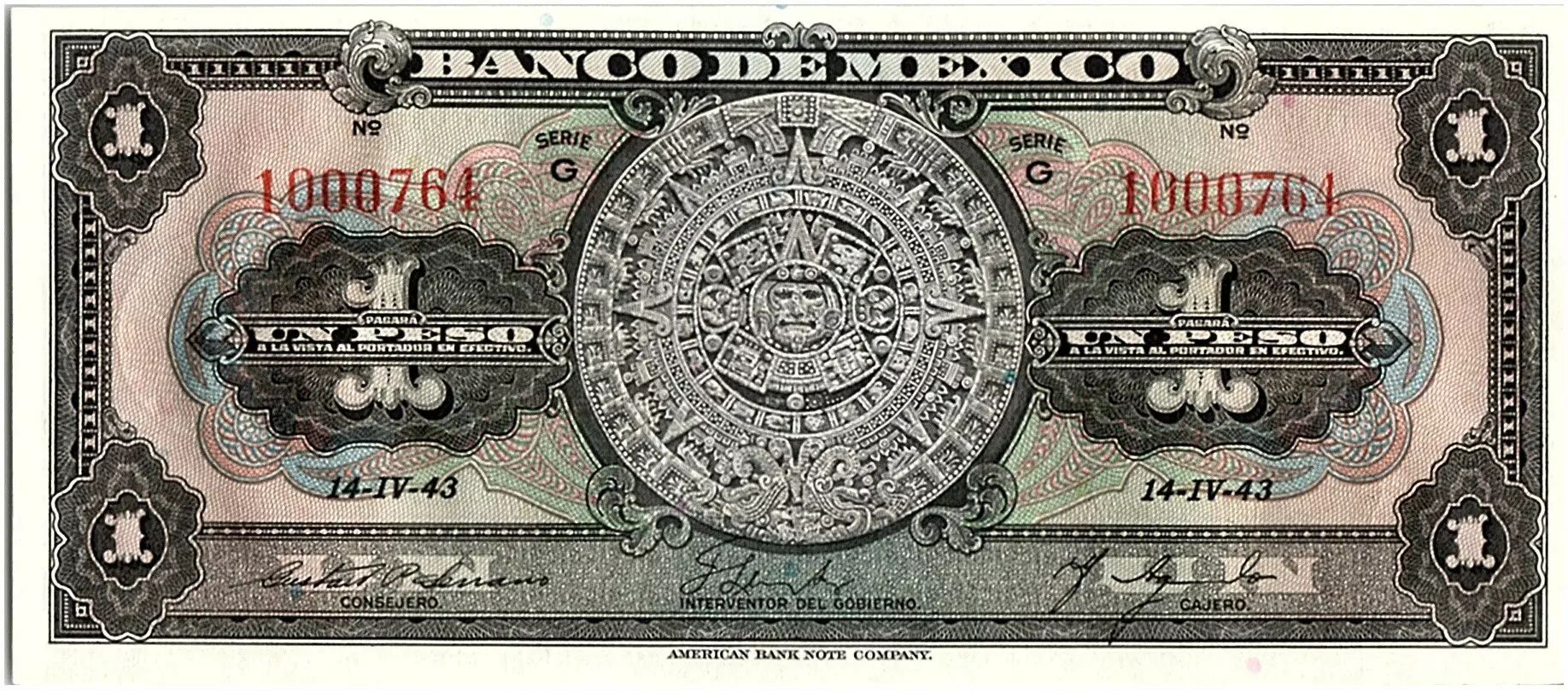 Billet Mexique 1 Peso - Calendrier Aztèque - Momument - 14/04/1943