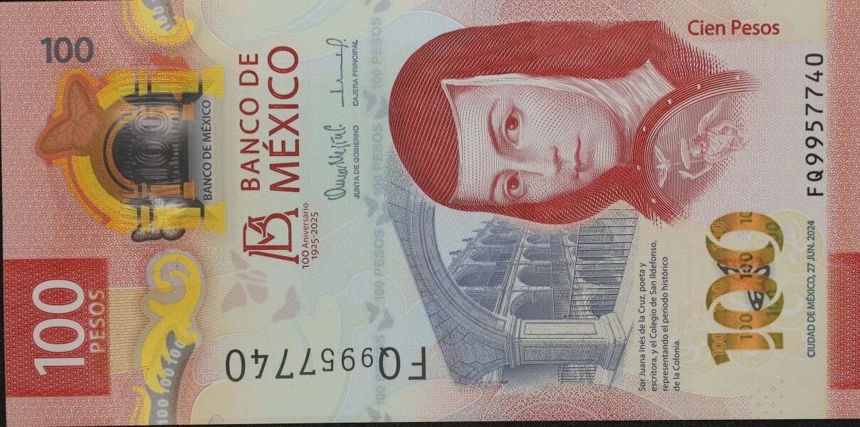 Ce billet de banque commémoratif, d'une valeur nominale de 100 pesos, a été émis par le Mexique en 2025. Il célèbre le 100e anniversaire de la Banque du Mexique.