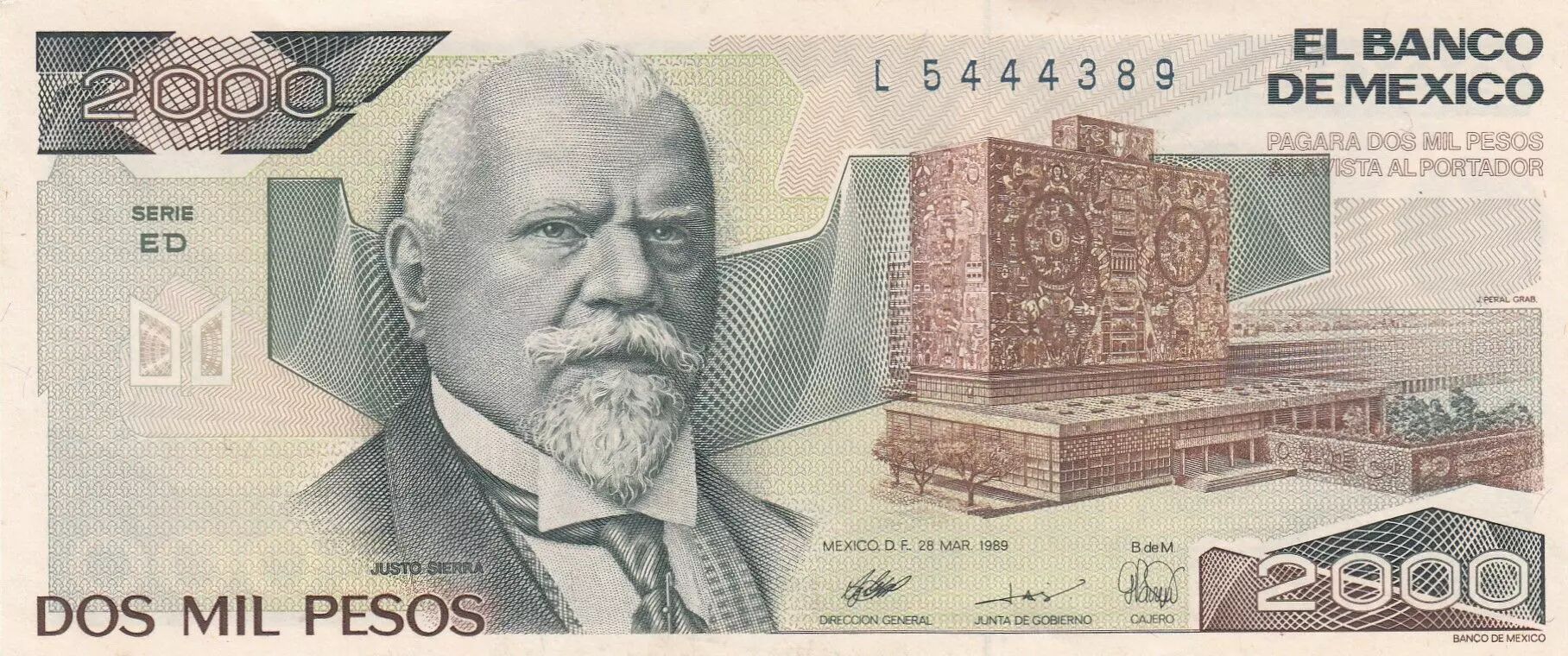Le design du billet inclut une représentation de Justo Sierra. Justo Sierra était un écrivain, historien, journaliste et homme politique mexicain. Il a joué un rôle important dans le développement de l'éducation au Mexique à la fin du 19e et au début du 20e siècle. Il a notamment contribué à la fondation de l'Universidad Nacional de México (aujourd'hui l'Universidad Nacional Autónoma de México, UNAM).