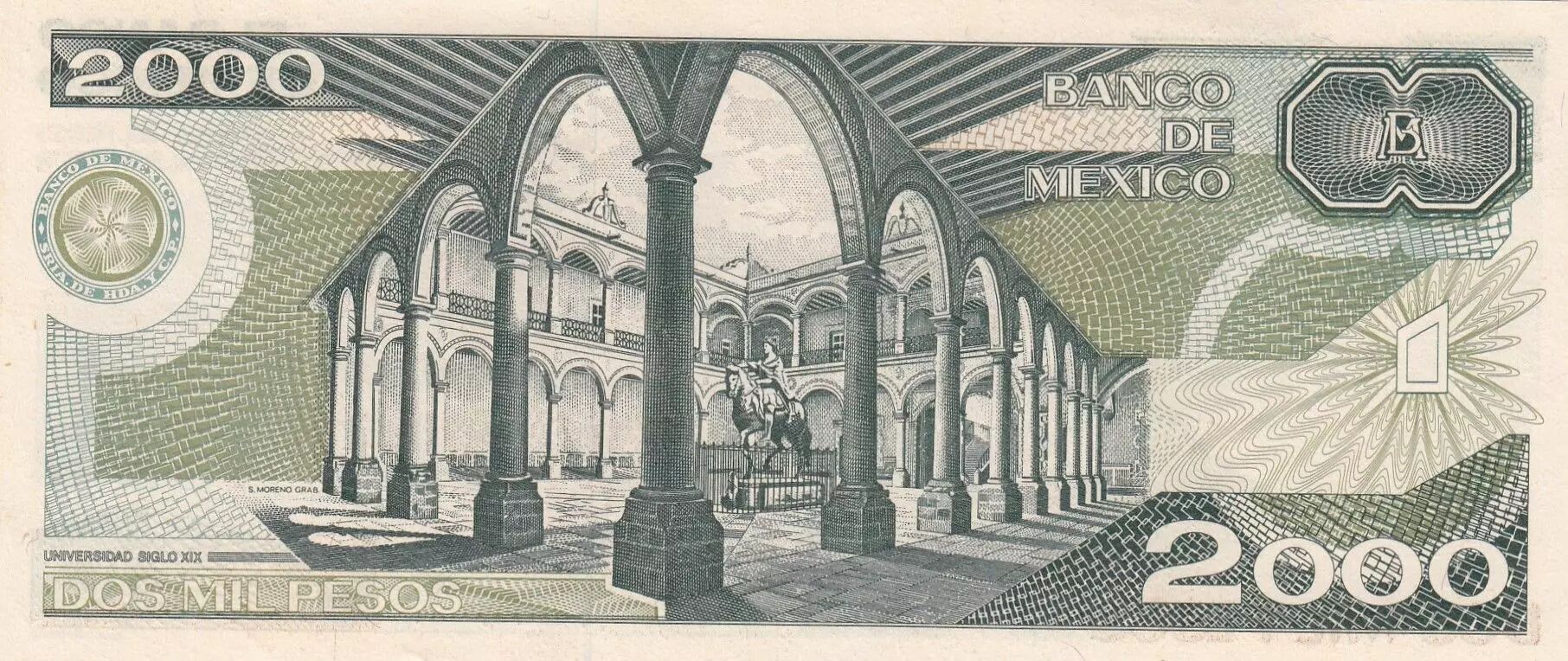 Le billet commémore probablement l'université ou met en évidence l'importance de l'éducation et de la culture au Mexique. Il est possible que le billet ait été émis pour honorer le rôle de Justo Sierra dans l'établissement ou le développement de l'institution universitaire. Le graphisme du billet comprend des éléments visuels associés à l'université, tels que des bâtiments universitaires, des symboles académiques ou des scènes de la vie étudiante. Les couleurs et le style général du billet reflètent l'esthétique de l'époque à laquelle il a été émis.