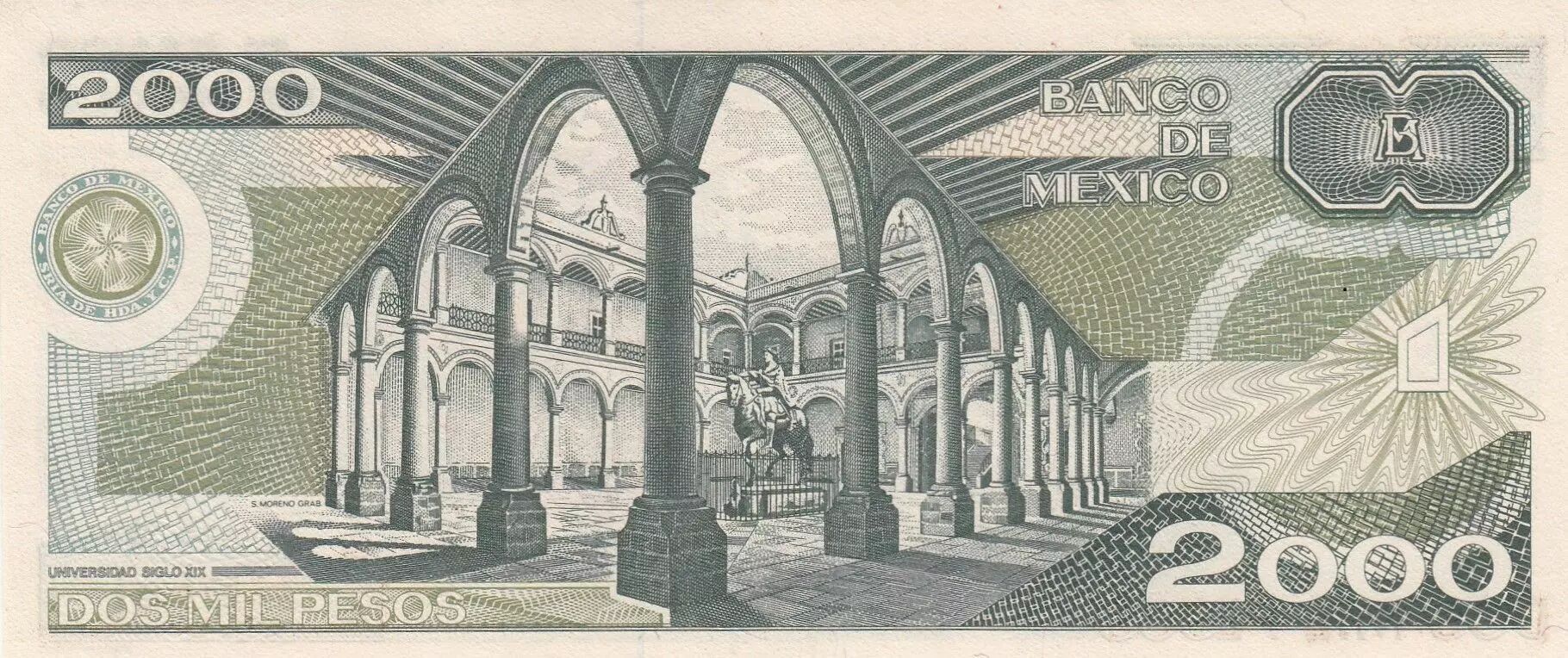 Le billet commémore probablement l'université ou met en évidence l'importance de l'éducation et de la culture au Mexique. Il est possible que le billet ait été émis pour honorer le rôle de Justo Sierra dans l'établissement ou le développement de l'institution universitaire. Le graphisme du billet comprend des éléments visuels associés à l'université, tels que des bâtiments universitaires, des symboles académiques ou des scènes de la vie étudiante. Les couleurs et le style général du billet reflètent l'esthétique de l'époque à laquelle il a été émis.