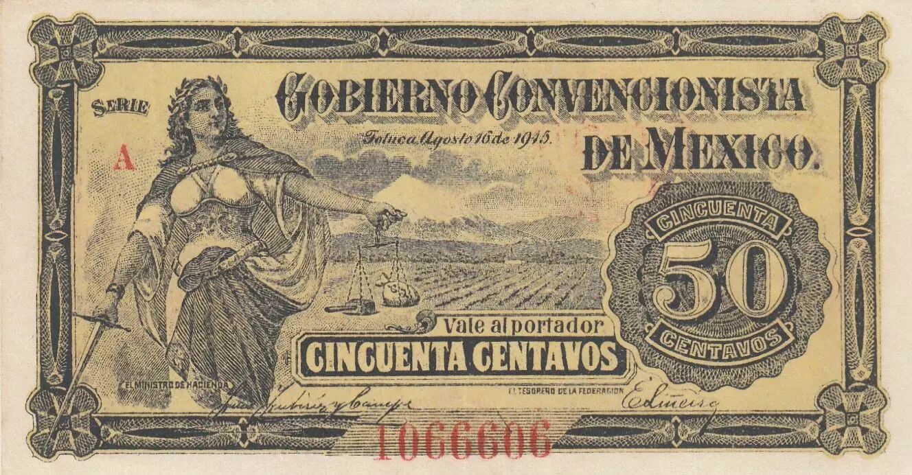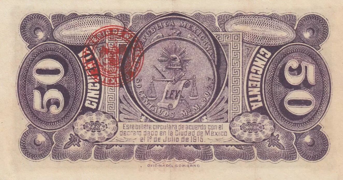 Le billet de 50 Centavos mexicain, émis en 1915, présente une impression recto en noir sur un fond subtilement coloré en orange et crème. Le numéro de série est imprimé en rouge. Sur la face principale, une figure féminine allégorique occupe la gauche du billet. Elle est représentée tenant une épée dans sa main droite et une balance dans sa main gauche, symbolisant potentiellement la justice et l'équilibre. La partie centrale de cette face illustre une scène rurale avec une ferme et une montagne enneigée en arrière-plan, évoquant un paysage mexicain typique. À droite, la valeur nominale du billet est mise en évidence par un guillochage ornemental.