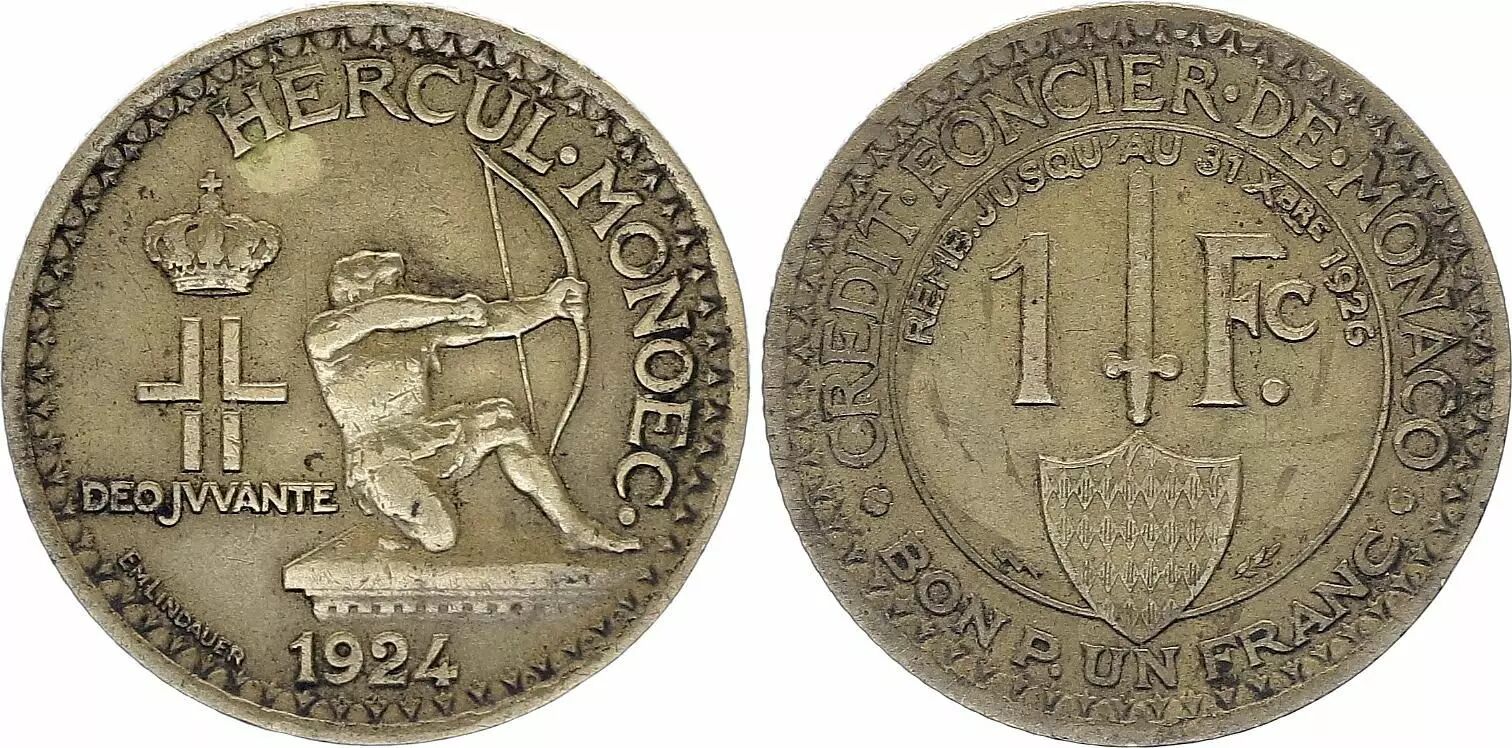 Pièce Monaco 1 Franc Héraclès Archer - 1924 - Poissy - TTB - KM.111