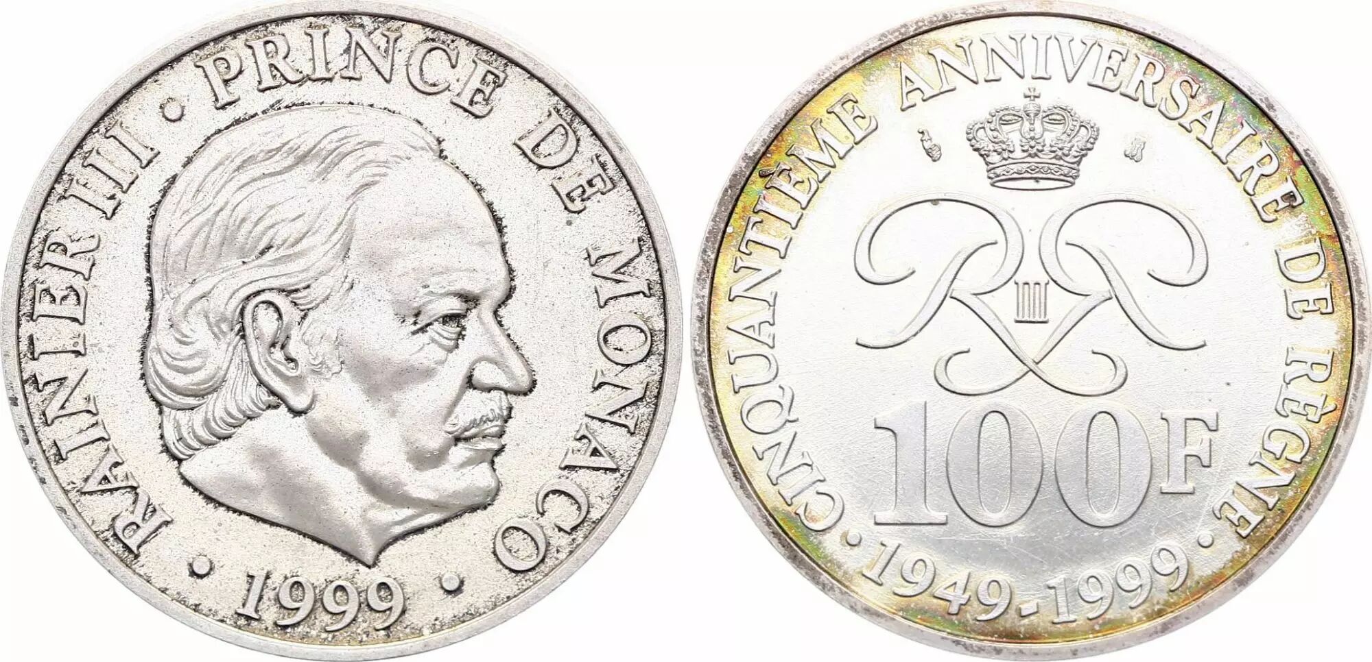 Home > > Monaco 100 Francs Rainier III - 50 years of Reign 1949-1999 - Silver