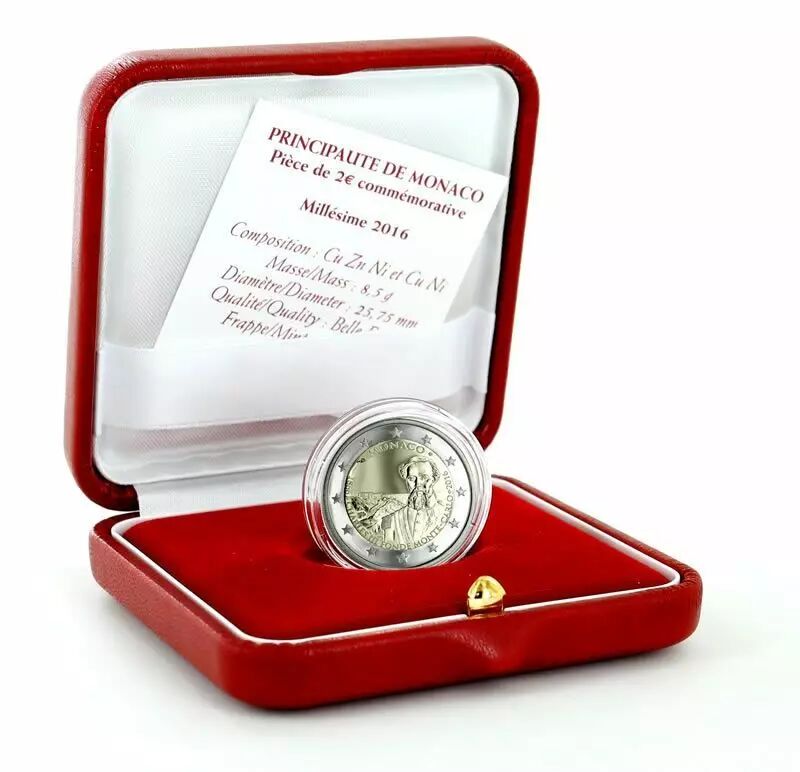 Pièce Monaco 2 Euros, 150 ans Fondation de Monte-Carlo - Frappe BE 2016 - étui carton abimé