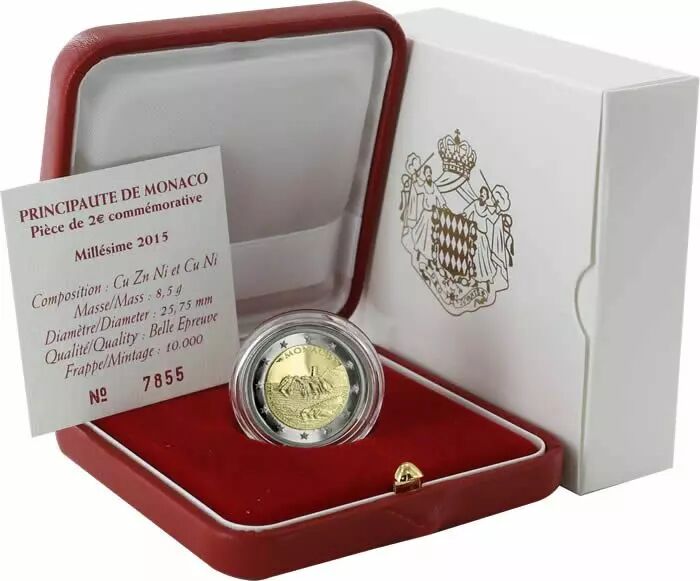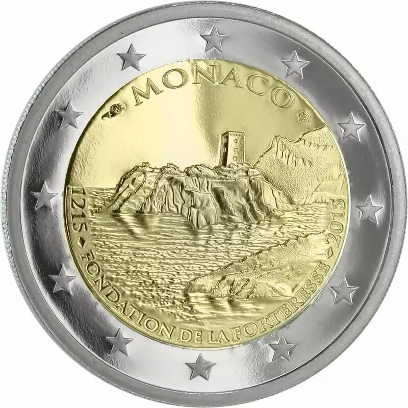Cette pièce commémorative de 2 euros, émise par Monaco en 2015, célèbre le 800e anniversaire de la construction de la première forteresse sur le rocher monégasque (1215-2015). Frappée en qualité Belle Epreuve (BE), elle présente un état de conservation soigné, bien que l'étui cartonné qui l'accompagne puisse montrer de légers signes d'usure.