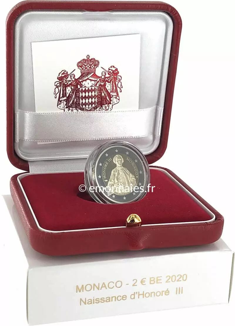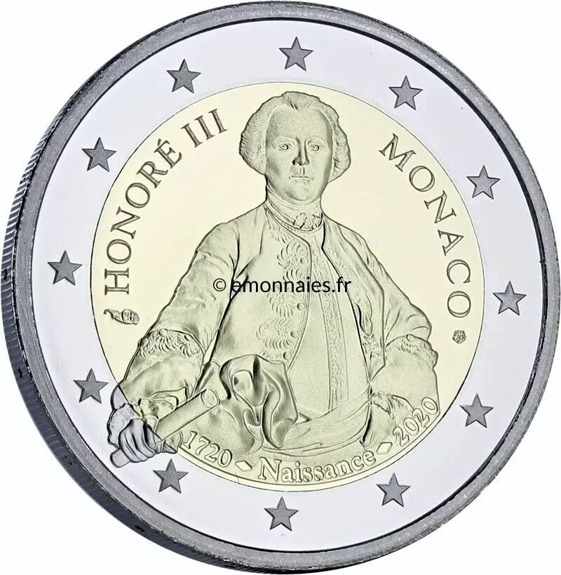 Cette pièce commémorative de 2 euros a été émise par Monaco en 2020 pour marquer le 300e anniversaire de la naissance du Prince Honoré III. La pièce est de type bimétallique, composée de deux alliages différents. Elle pèse 8,5 grammes et a un diamètre de 25,75 millimètres, avec une épaisseur de 2,2 millimètres.