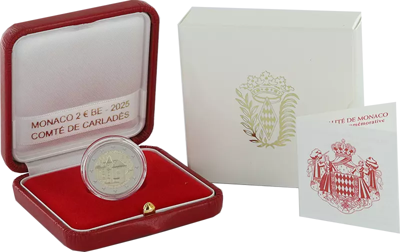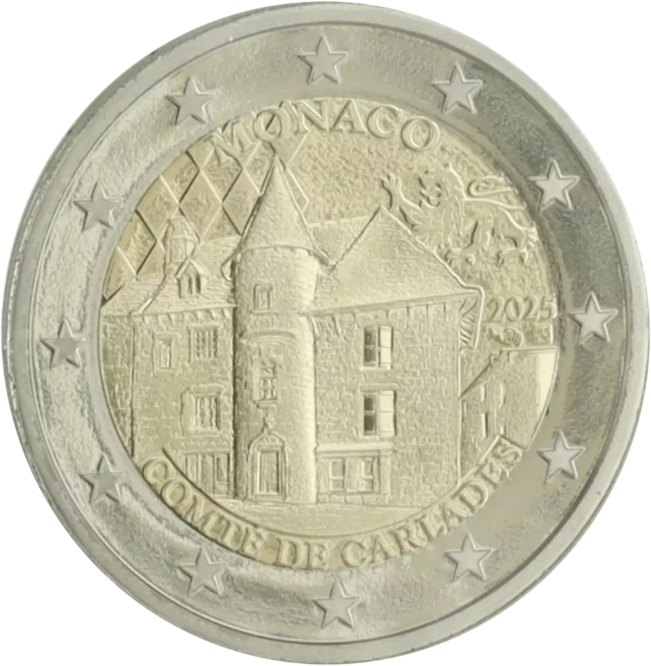 This 2 euro commemorative coin, minted by Monaco, is dedicated to Carladès and dated 2025. It is made of bimetal, combining two different alloys to form the coin.
