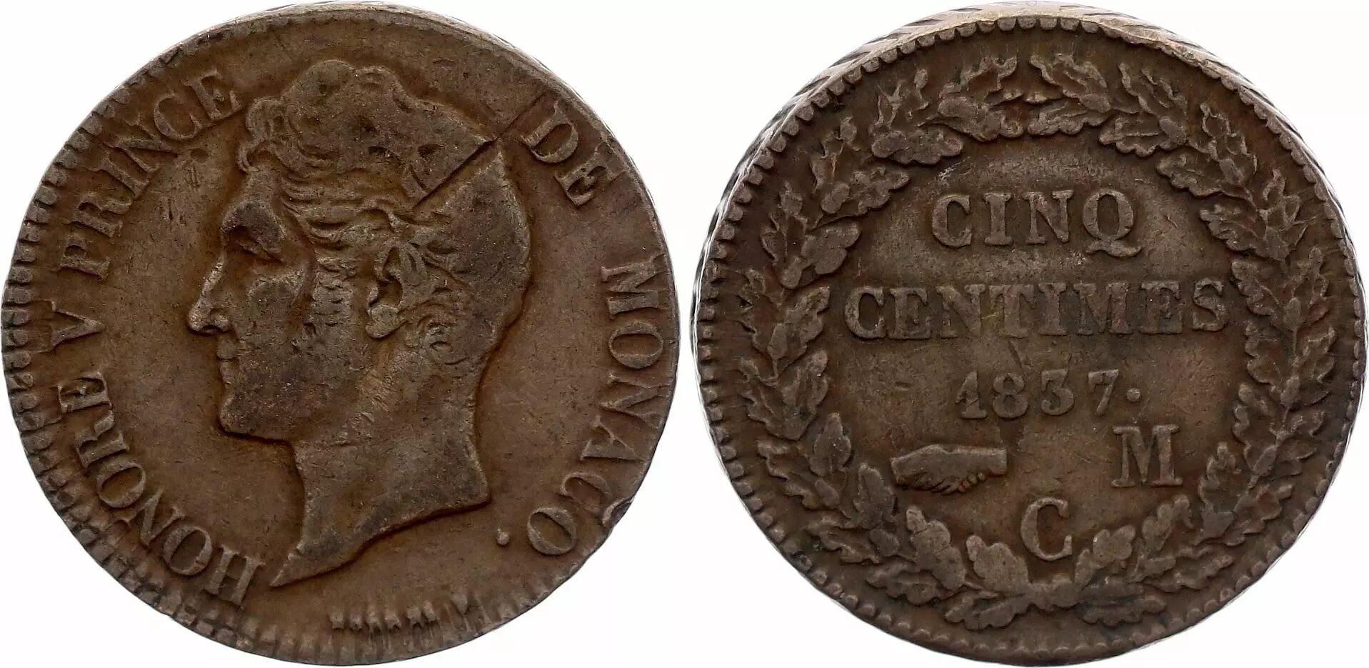 Home > World Coins > European Currencies > Monaco > Monaco 5 Centimes Honoré V - 1837 MC
