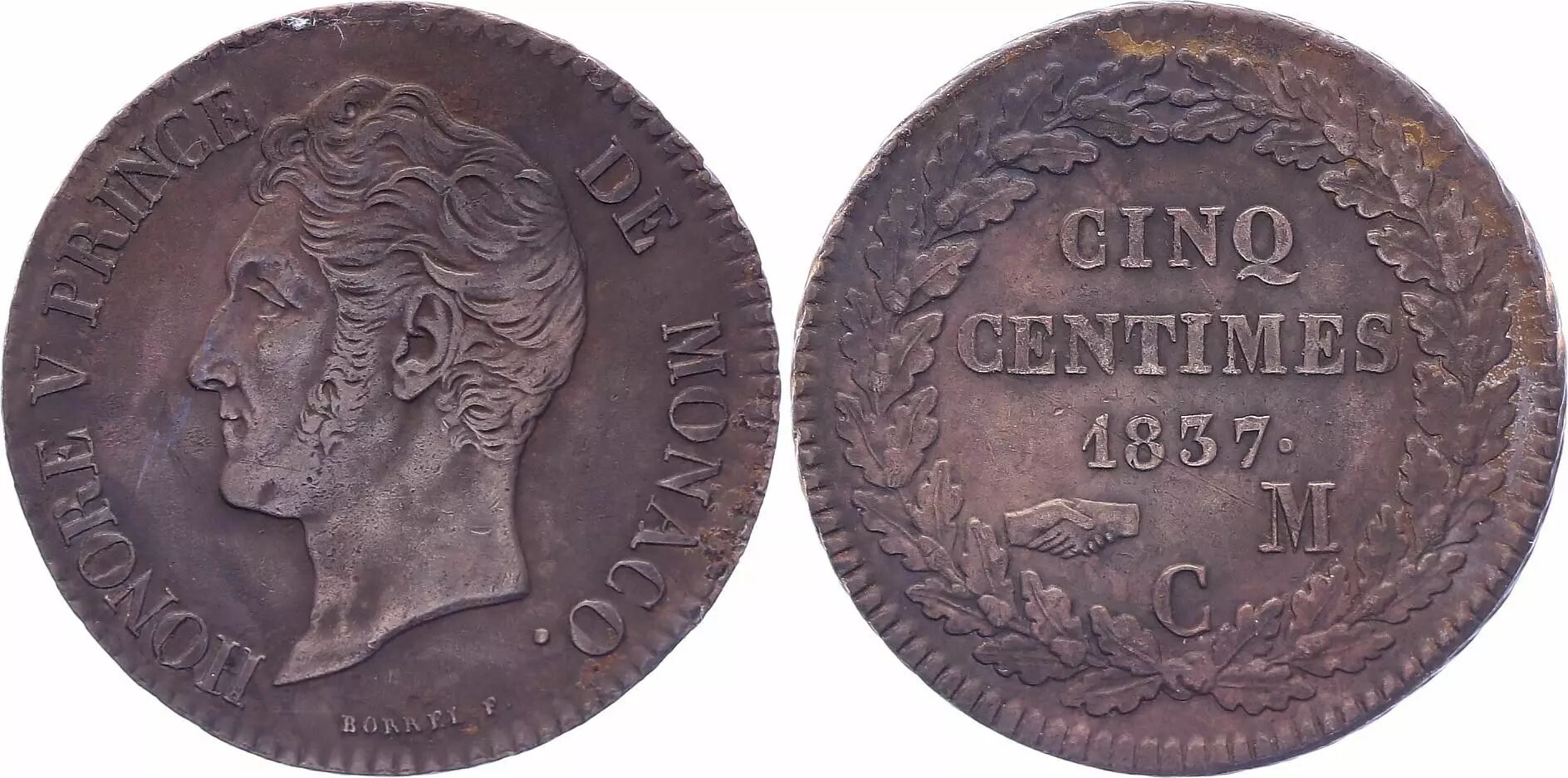 Coin Monaco 5 Centimes Honoré V - 1837 MC - Gad MC 102