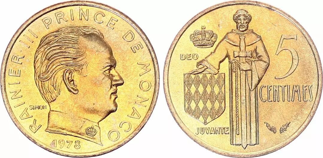 La pièce de 5 centimes de Monaco, datée de 1978, présente des caractéristiques distinctes sur ses deux faces. Frappée en cupro-aluminium, elle pèse 2 grammes et possède un diamètre de 17 millimètres.