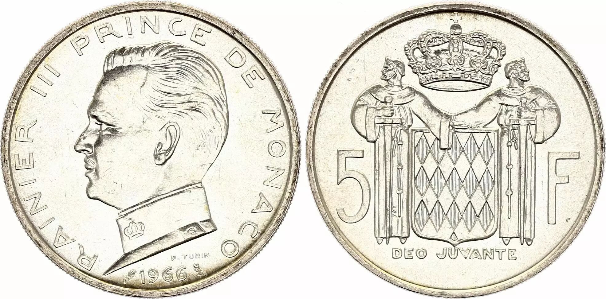 This silver 5 Francs coin was minted in Monaco in 1966. It is dedicated to Prince Rainier III.