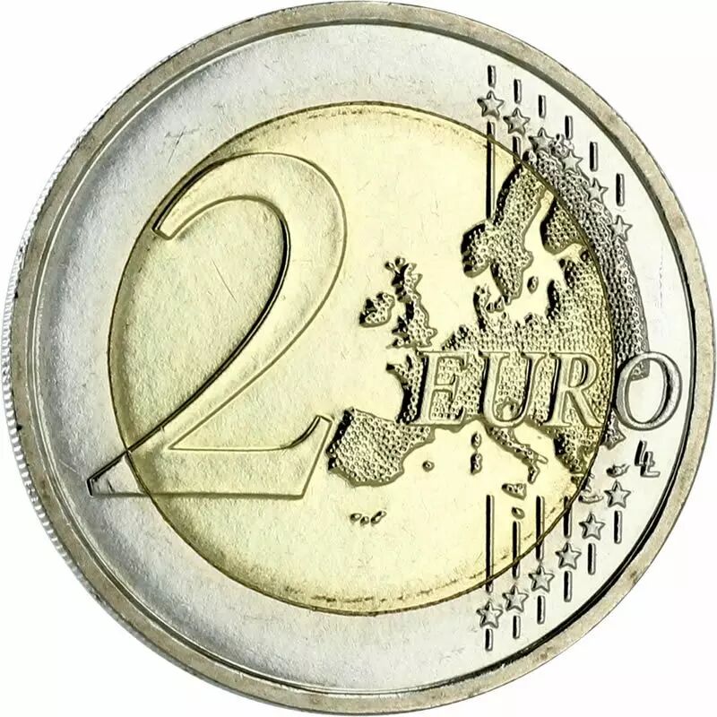 Le revers de la pièce est conforme à la conception standard des pièces de 2 euros, comprenant la carte de l'Europe et la valeur faciale. Cette face est commune à toutes les pièces de 2 euros émises par les pays de la zone euro, avec des variations mineures en fonction du pays émetteur. La pièce a été frappée avec une qualité de frappe Brillant Universel (BU), ce qui indique une attention particulière à la qualité de sa production, lui conférant un aspect esthétique supérieur pour les collectionneurs.
