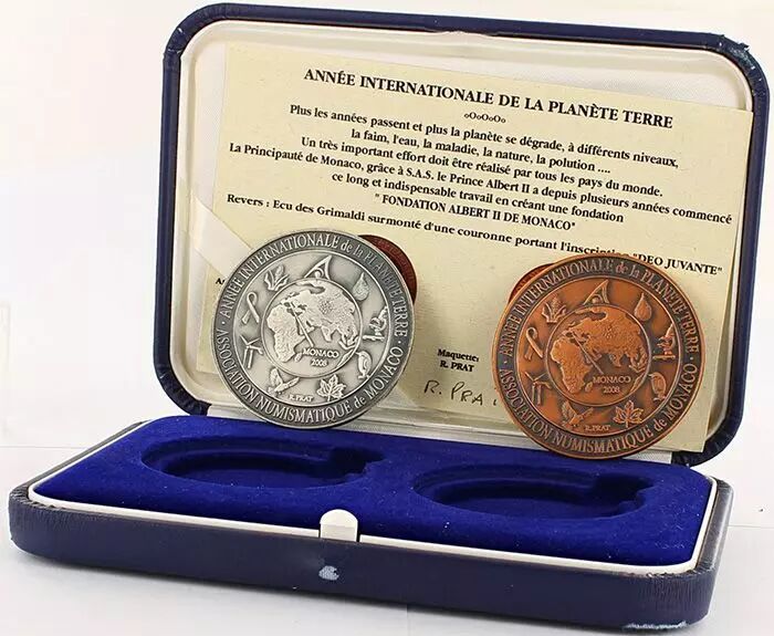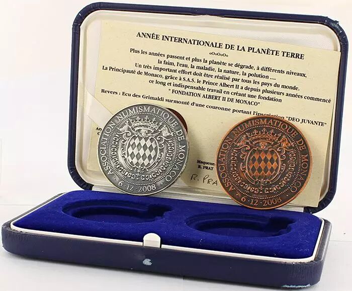 Box with 2 medals one in copper drawing 40 ex. and 1 in silver drawing 100 ex. Made in 2008 by the numismatic association of Monaco in honor of the Albert II Foundation.