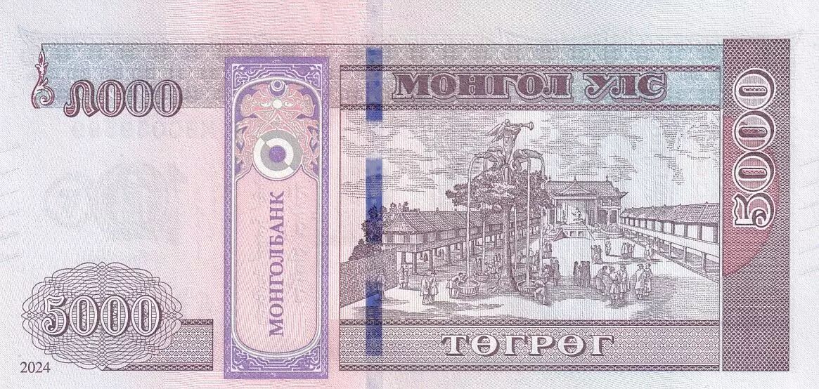 The 5000 tugrik banknote from Mongolia, issued in 2024, commemorates the 100th anniversary of the creation and strengthening of the country's modern banking system. This banknote is part of a special MB series.