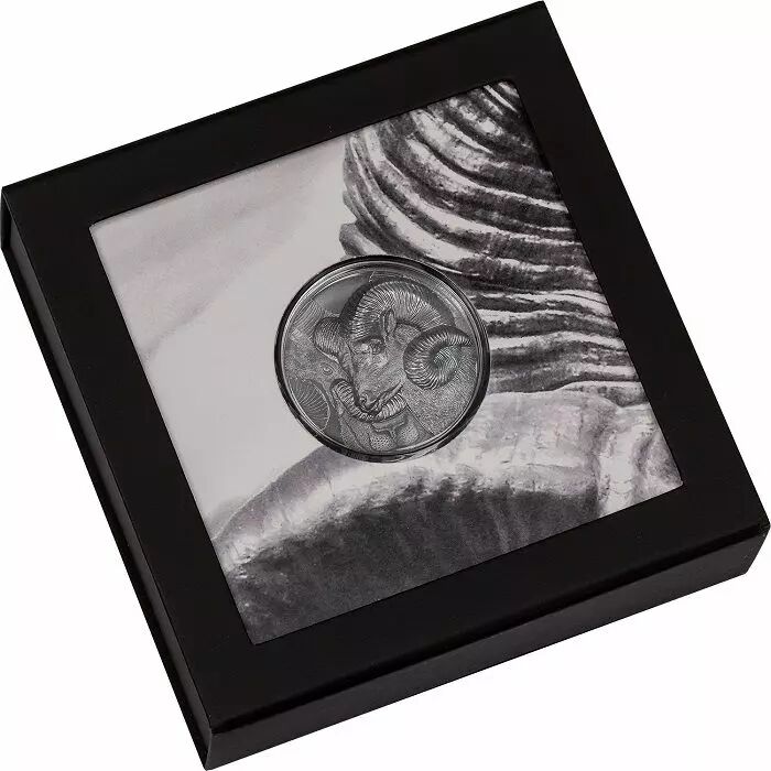 The reverse of each of these superb coins features a front and side view of an argali. The profile view is struck in ultra-high relief with an incredible amount of detail on the fur and horn. The smartminting® relief extends right to the edge of the coin! A sublime image of this graceful animal. Fine detail and relief combine. The obverse shows the corkscrew horns of an argali in ultra-high relief. The back features a unique geometric pattern with the date "2022" stamped into the design.