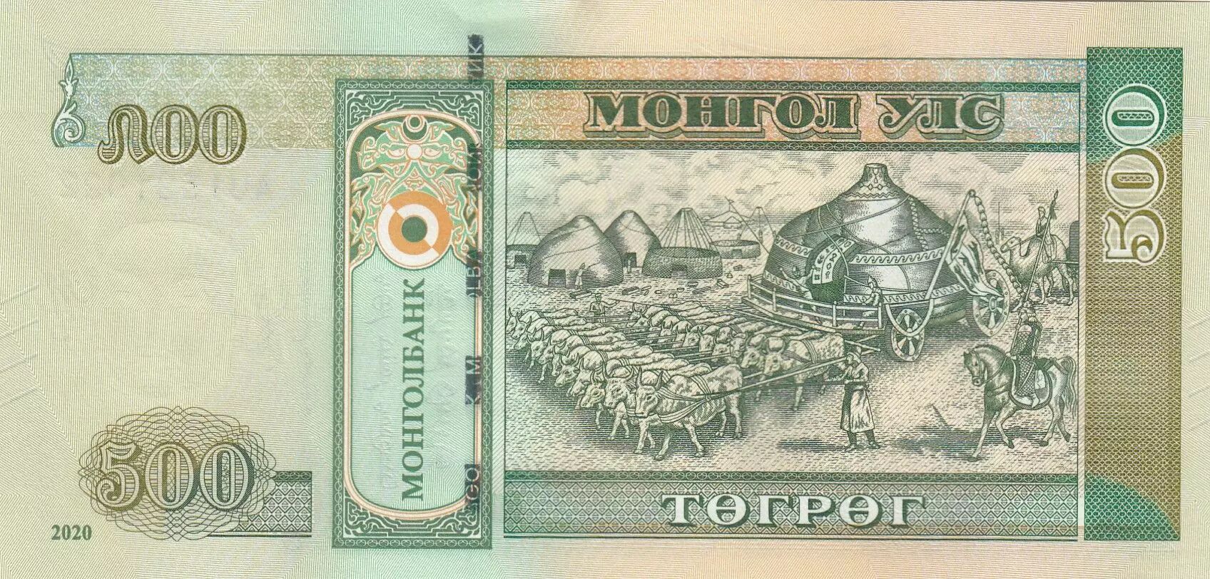 Ce billet de banque est émis par la Mongolie, avec une valeur nominale de 500 tugrik. Il date de l'année 2020 et appartient à une série non spécifiée. Ses dimensions sont de 145 mm de longueur et 70 mm de largeur.