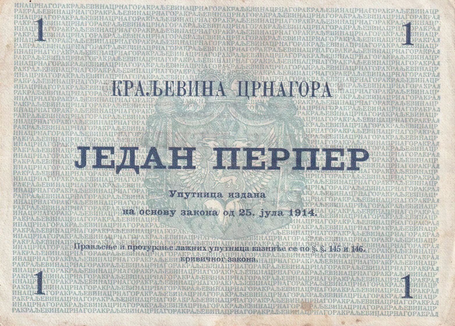 Billet Monténégro 1 Perper - Armoiries - 1914 - Série F.25 - P.15
