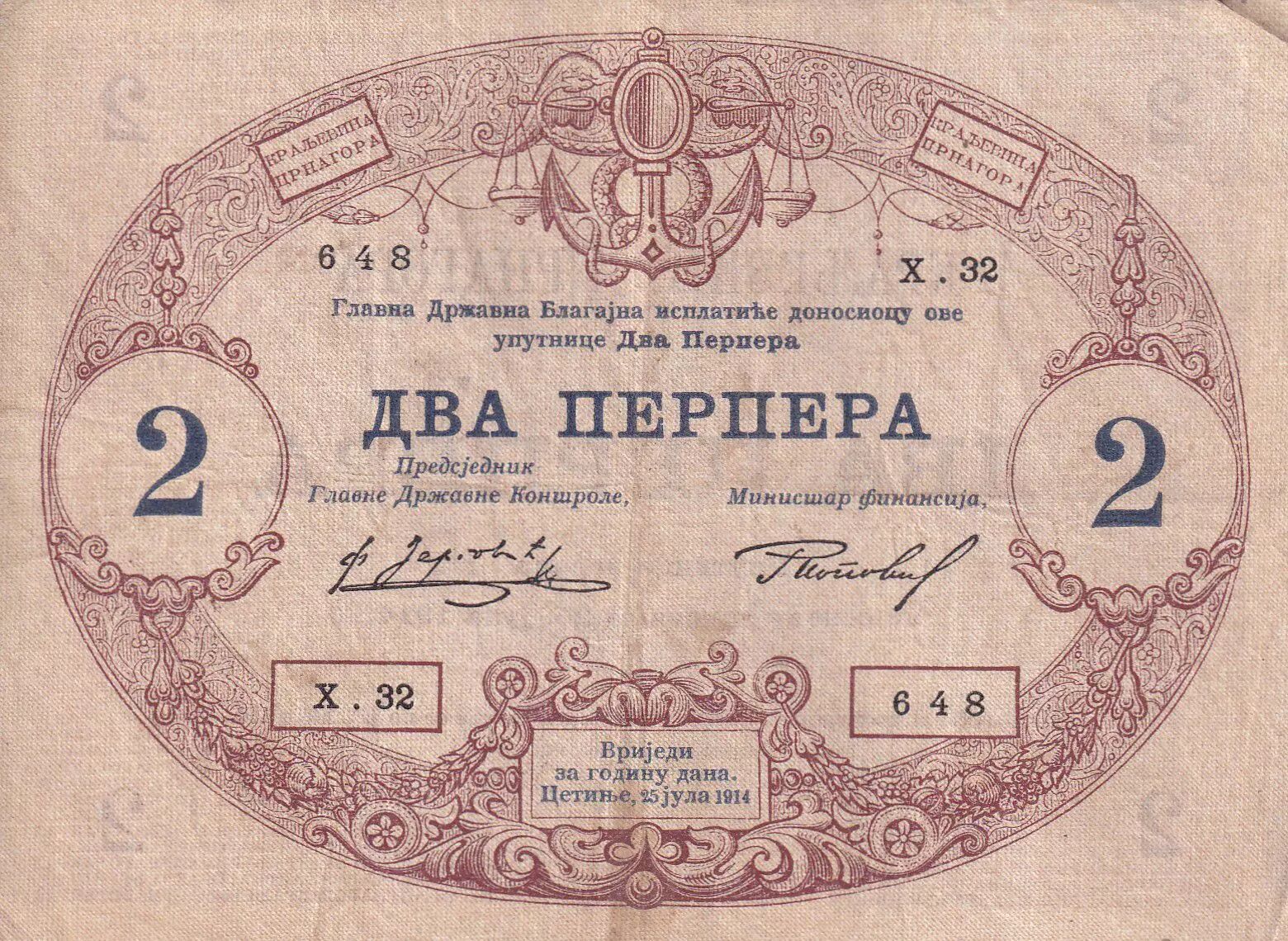 Billet Monténégro 2 Perpera - Armoiries - 1914 - Série X.32 - P.16