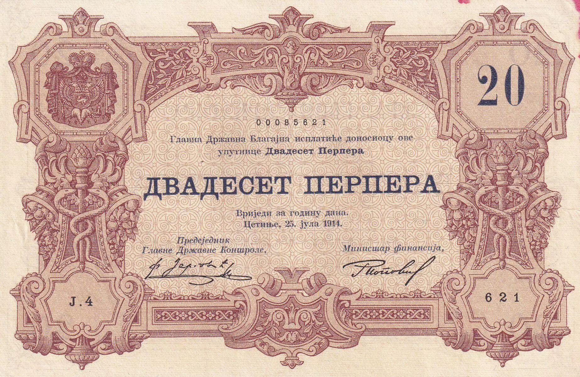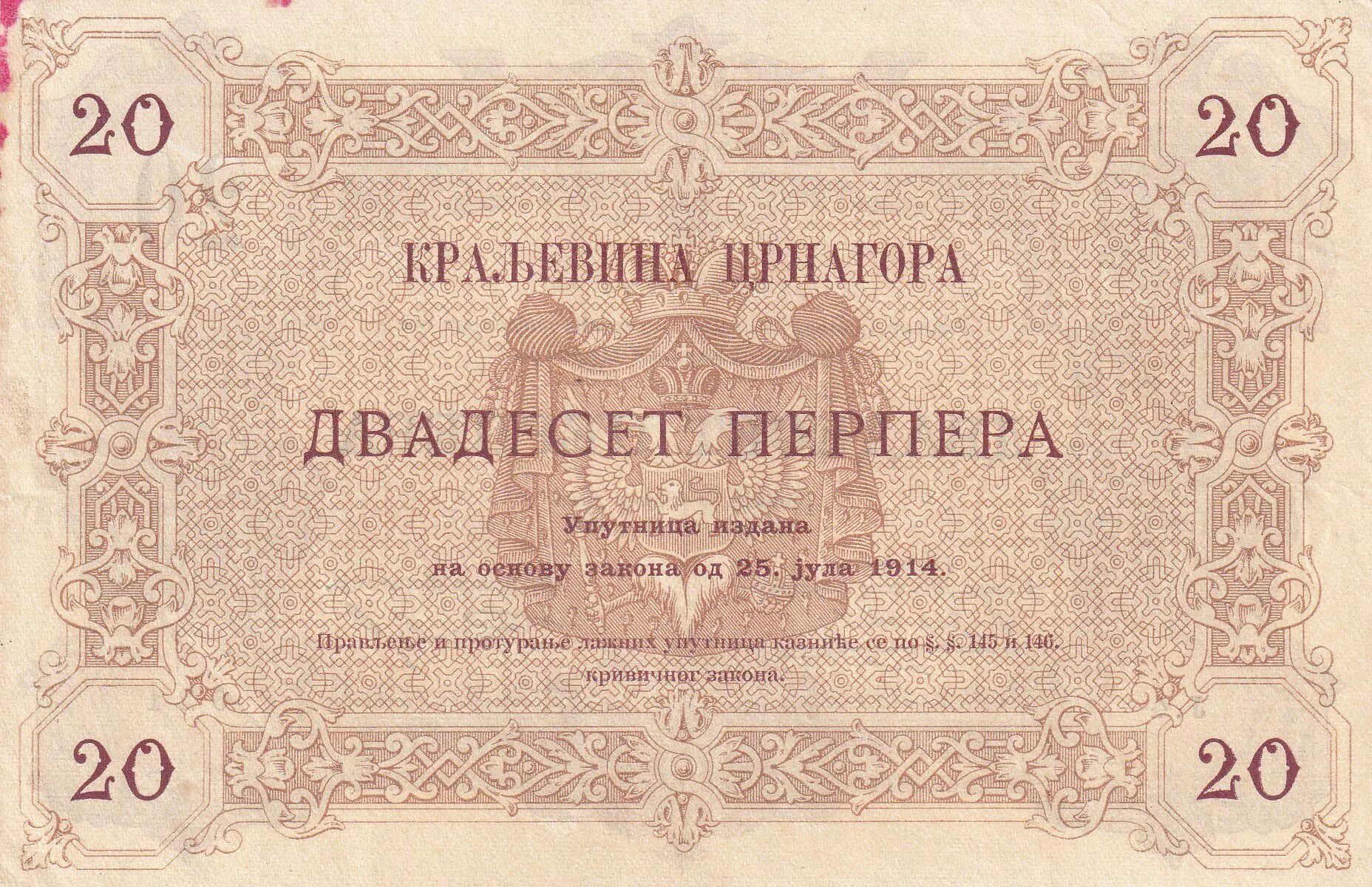 Billet Monténégro 20 Perpera - Armoiries - 1914 - Série J.4- P.19